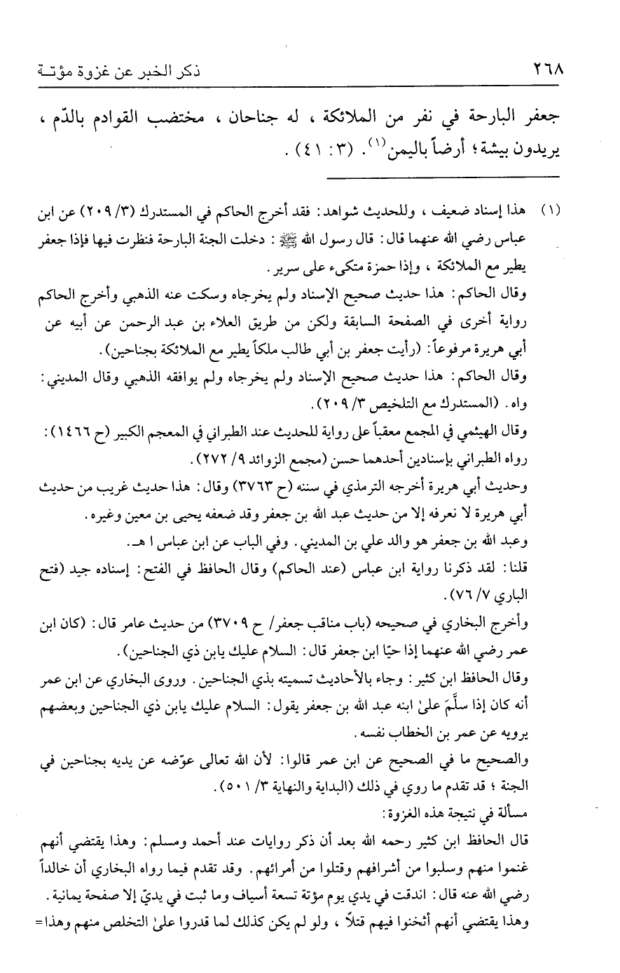 والصحيح ما في الصحيح عن ابن عمر قالوا: لأن الله تعالى عوّضه عن يديه بجناحين في الجنة؛ قد تقدم ما روي في ذلك (البداية والنهاية ٣/ ٥٠١).