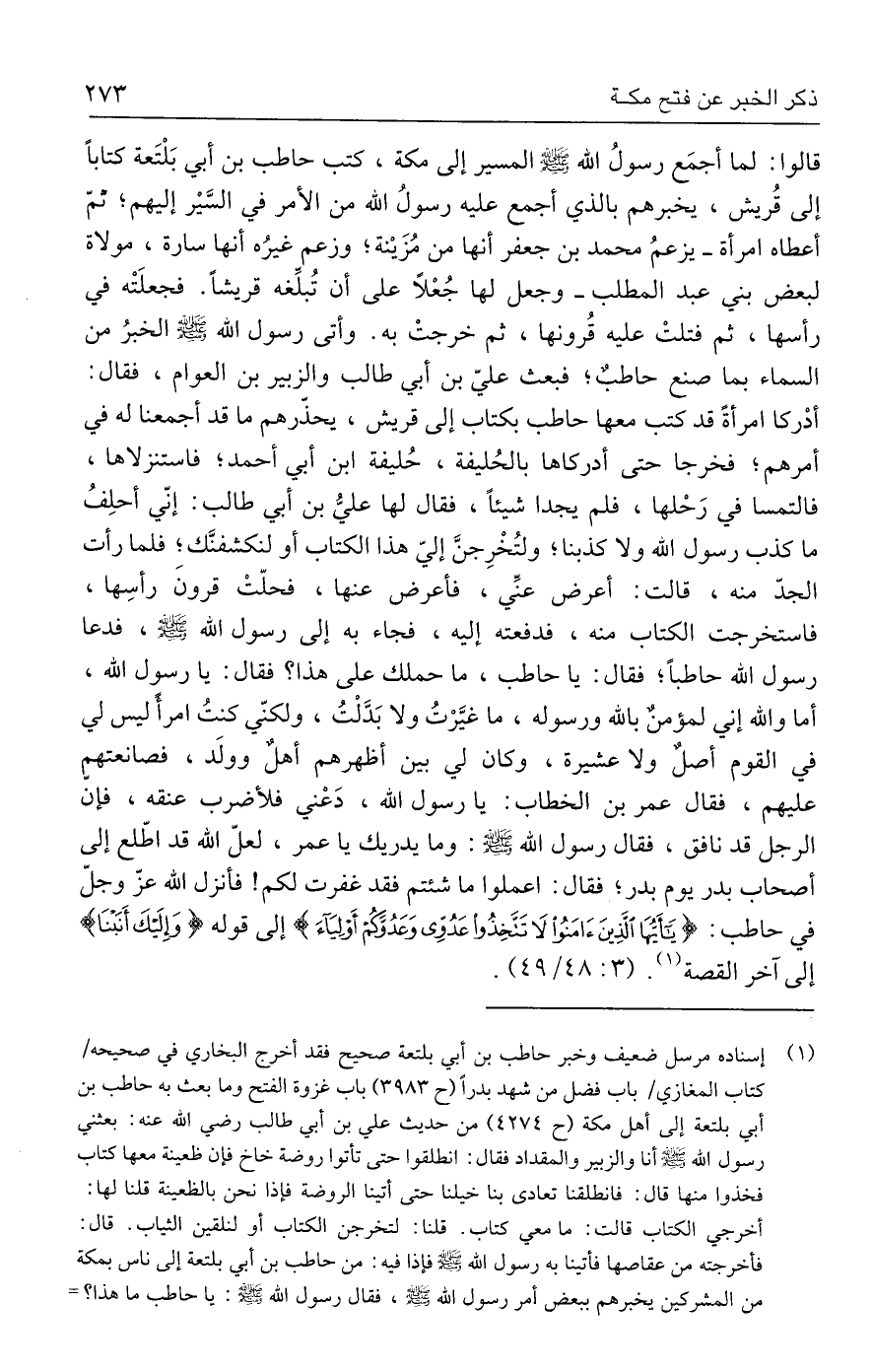 (١) إسناده مرسل ضعيف وخبر حاطب بن أبي بلتعة صحيح فقد أخرج البخاري في صحيحه / كتاب المغازي / باب فضل من شهد بدرًا (ح ٣٩٨٣) باب غزوة الفتح وما بعث به حاطب بن أبي بلتعة إلي أهل مكة (ح ٤٢٧٤) من حديث علي بن أبي طالب رضي الله عنه: بعثني رسول الله - صلى الله عليه وسلم - أنا والزبير والمقداد فقال: انطلقوا حتى تأتوا روضة خاخ فإن ظعينة معها كتاب فخذوا منها قال: فانطلقنا تعادي بنا خيلنا حتى أتينا الروضة فإذا نحن بالظعينة قلنا لها: أخرجي الكتاب قالت: ما معي كتاب. قلنا: لتخرجن الكتاب أو لنقين الثياب. قال: فأخرجته من عقاصها فأتينا به رسول الله - صلى الله عليه وسلم - فإذا فيه: من حاطب بن أبي بلتعة إلي ناس بمكة من المشركين يخبرهم ببعض أمر رسول الله - صلى الله عليه وسلم -، فقال رسول الله - صلى الله عليه وسلم -: يا حاطب ما هذا؟ =