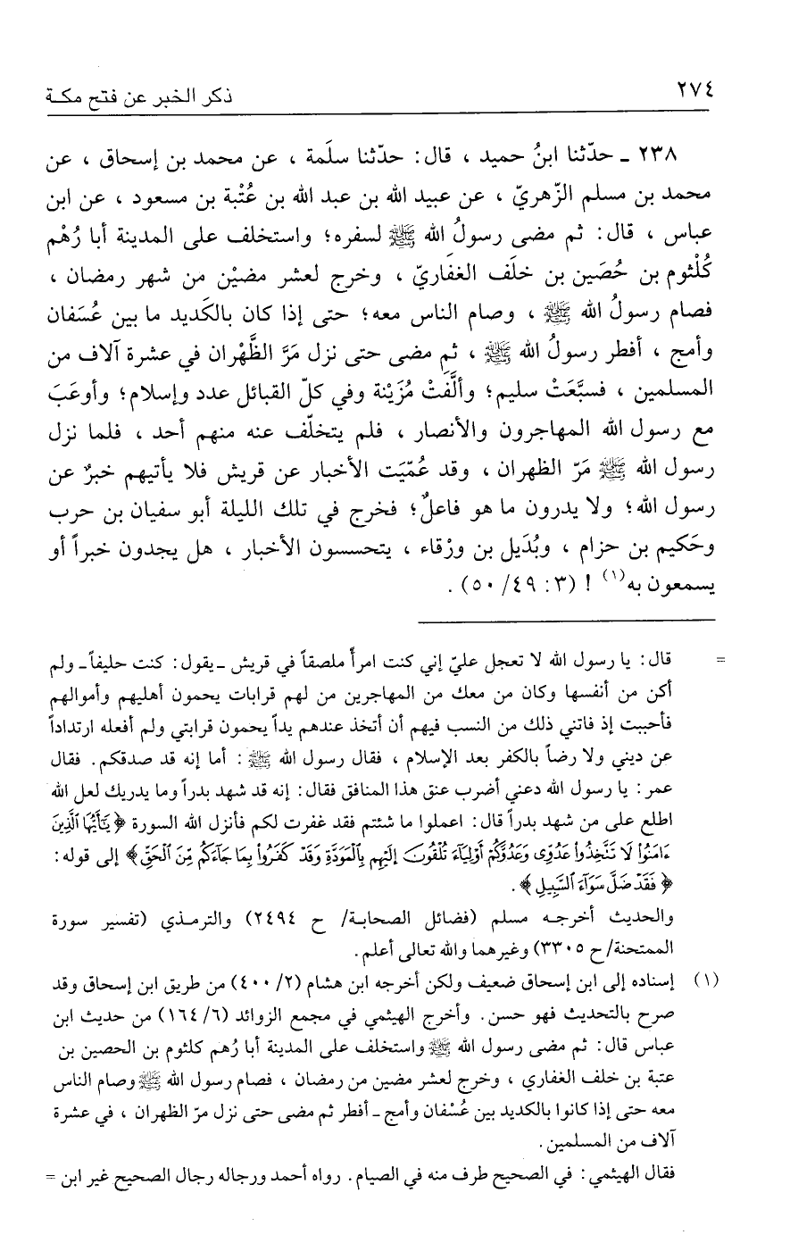 ٢٣٨ - حدَّثنا ابنُ حميد، قال: حدَّثنا سلَمة، عن محمد بن إسحاق، عن محمد بن مسلم الزّهريّ، عن عبيد الله بن عبد الله بن عُتْبة بن مسعود، عن ابن عباس، قال: ثم مضي رسولُ الله - صلى الله عليه وسلم - لسفره؛ واستخلف علي المدينة أبا رُهْم كُلْثوم بن حُصين بن خلَف الغفَاريّ، وخرج لعشر مضين من شهر رمضان، فصام رسولُ الله - صلى الله عليه وسلم -، وصام الناس معه؛ حتى إذا كان بالكَديد ما بين عُسَفان وأمج، أفطر رسولُ الله - صلى الله عليه وسلم -، ثم مضي حتى نزل مَرَّ الظَّهْران في عشرة آلاف من المسلمين، فسبَّعَتْ سليم؛ وألَّفَتْ مُزَينة وفي كلّ القبائل عدد وإسلام؛ وأوعَبَ مع رسول الله المهاجرون والأنصار، فلم يتخلّف عنه منهم أحد، فلما نزل رسول الله - صلى الله عليه وسلم - مَرّ الظهران، وقد عُمّيَت الأخبار عن قريش فلا يأتيهم خبرٌ عن رسول الله؛ ولا يدرون ما هو فاعلٌ؛ فخرج في تلك الليلة أبو سفيان بن حرب وحَكيم بن حزام، وبُدَيل بن ورْقاء، يتحسسون الأخبار، هل يجدون خبرًا أو يسمعون به (١)! (٣: ٤٩/ ٥٠).