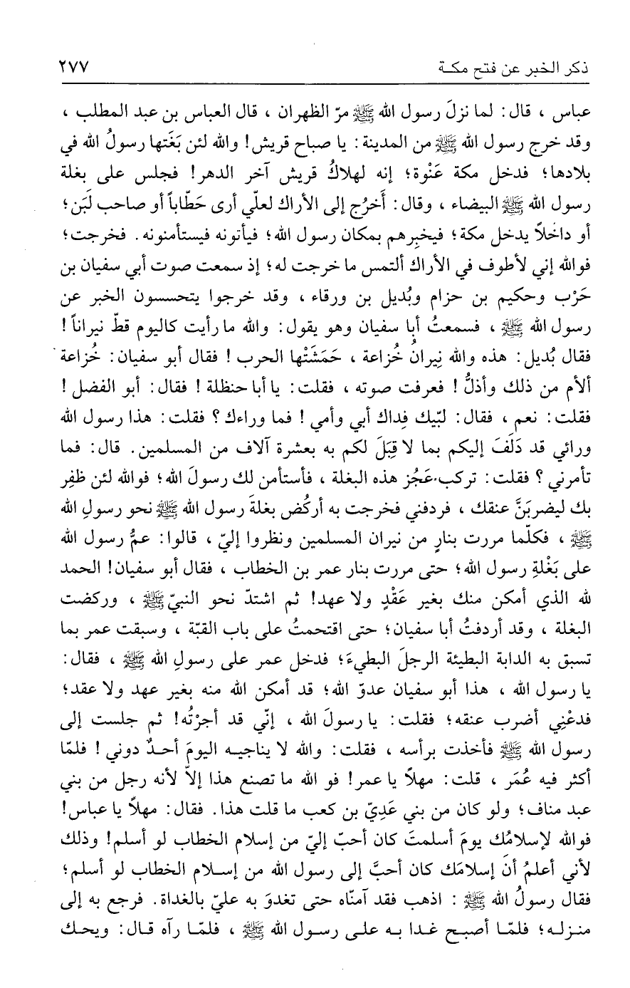 عباس، قال: لما نزلَ رسول الله - صلى الله عليه وسلم - مرّ الظهران، قال العباس بن عبد المطلب، وقد خرج رسول الله - صلى الله عليه وسلم - من المدينة: يا صباح قريش! والله لئن بَغَتها رسولُ الله في بلادها؛ فدخل مكة عَنْوة؛ إنه لهلاكُ قريش آخر الدهر! فجلس علي بغلة رسول الله - صلى الله عليه وسلم - البيضاء، وقال: أَخرُج إلي الأراك لعلّي أري حَطّابًا أو صاحب لَبَن؛ أو داخلًا يدخل مكة؛ فيخبِرهم بمكان رسول الله؛ فيأتونه فيستأمنونه. فخرجت؛ فوالله إني لأطوف في الأراك ألتمس ما خرجت له؛ إذ سمعت صوت أبي سفيان بن حَرْب وحكيم بن حزام وبُديل بن ورقاء، وقد خرجوا يتحسسون الخبر عن رسول الله - صلى الله عليه وسلم -، فسمعتُ أبا سفيان وهو يقول: والله ما رأيت كاليوم قطّ نيرانًا! فقال بُديل: هذه والله نِيرانُ خُزاعة، حَمَشَتْها الحرب! فقال أبو سفيان: خُزاعة ألأم من ذلك وأذلُّ! فعرفت صوته، فقلت: يا أبا حنظلة! فقال: أبو الفضل! فقلت: نعم، فقال: لبّيك فِداك أبي وأمي! فما وراءك؟ فقلت: هذا رسول الله ورائي قد دَلَفَ إليكم بما لا قِبَلَ لكم به بعشرة آلاف من المسلمين. قال: فما تأمرني؟ فقلت: تركب عَجُز هذه البغلة، فأستأمن لك رسولَ الله؛ فوالله لئن ظفِر بك ليضربَنَّ عنقك، فردفني فخرجت به أركُض بغلةَ رسول الله - صلى الله عليه وسلم - نحو رسولِ الله - صلى الله عليه وسلم -، فكلّما مررت بنارٍ من نيران المسلمين ونظروا إليّ، قالوا: عمُّ رسول الله علي بَغْلةِ رسول الله؛ حتى مررت بنار عمر بن الخطاب، فقال أبو سفيان! الحمد لله الذي أمكن منك بغير عَقْدٍ ولا عهد! ثم اشتدّ نحو النبيّ - صلى الله عليه وسلم -، وركضت البغلة، وقد أردفتُ أبا سفيان؛ حتى اقتحمتُ علي باب القبّة، وسبقت عمر بما تسبق به الدابة البطيئة الرجلَ البطيءَ؛ فدخل عمر علي رسولِ الله - صلى الله عليه وسلم -، فقال: يا رسول الله، هذا أبو سفيان عدوّ الله؛ قد أمكن الله منه بغير عهد ولا عقد؛ فدعْنِي أضرب عنقه؛ فقلت: يا رسولَ الله، إنّي قد أجرْتُه! ثم جلست إلي رسول الله - صلى الله عليه وسلم - فأخذت برأسه، فقلت: والله لا يناجيه اليومَ أحدٌ دوني! فلمّا أكثر فيه عُمَر، قلت: مهلًا يا عمر! فوالله ما تصنع هذا إلّا لأنه رجل من بني عبد مناف؛ ولو كان من بني عَدِيّ بن كدب ما قلت هذا. فقال: مهلًا يا عباس! فوالله لإسلامُك يومَ أسلمتَ كان أحبَّ إليّ من إسلام الخطاب لو أسلم! وذلك لأني أعلمُ أن إسلامَك كان أحبَّ إلي رسول الله من إسلام الخطاب لو أسلم؛ فقال رسولُ الله: اذهب فقد آمنّاه حتى تغدوَ به عليّ بالغداة. فرجع به إلي منزله؛ فلمّا أصبح غدا به علي رسول الله - صلى الله عليه وسلم -، فلمّا رآه قال: ويحك