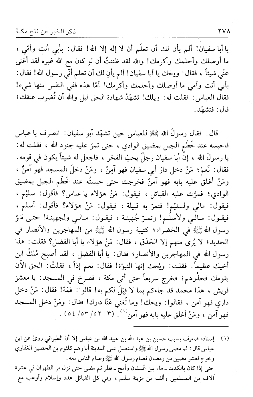 يا أبا سفيان! ألم يأن لك أن تعلَم أن لا إله إلا الله! فقال: بأبي أنت وأمّي، ما أوصلك وأحلمك وأكرمك! والله لقد ظننتُ أن لو كان مع الله غيره لقد أغني عنّي شيئًا، فقال: ويحك يا أبا سفيان! ألم يأنِ لك أن تعلم أنّي رسول الله! فقال؛ بأبي أنت وأمي ما أوصلك وأحلمك وأكرمك! أمّا هذه ففي النفس منها شيء! فقال العباس: فقلت له: ويلك! تشهّدْ شهادة الحق قبل والله أن تُضرب عنقك؛ قال: فتشهد.