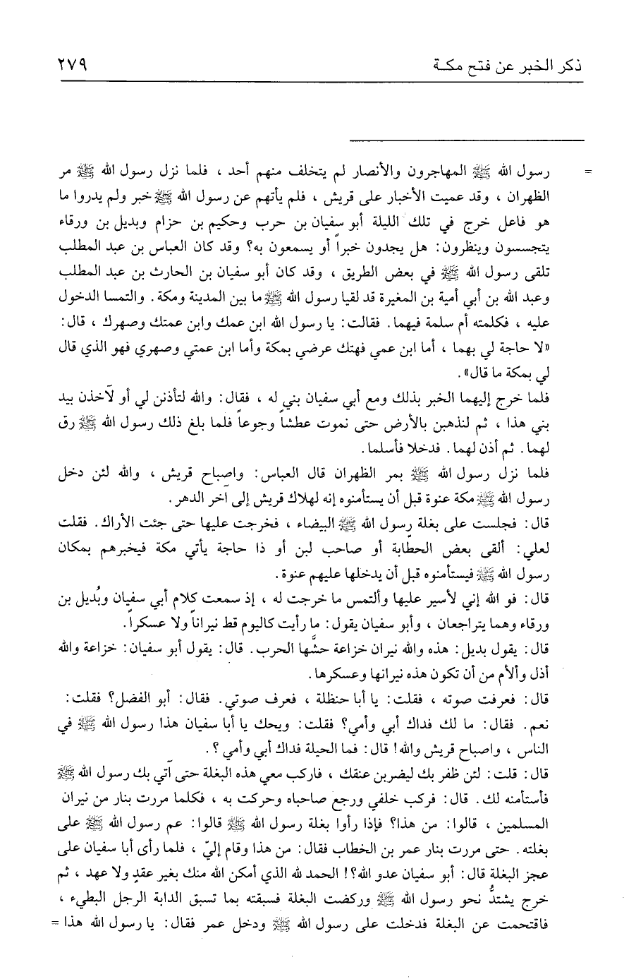 قال: قلت: لئن ظفر بك ليضربن عنقك، فاركب معي هذه البغلة حتى آتي بك رسول الله - صلى الله عليه وسلم - فأستأمنه لك. قال: فركب خلفي ورجع صاحباه وحركت به، فكلما مررت بنار من نيران المسلمين، قالوا: من هذا؟ فإذا رأوا بغلة رسول الله - صلى الله عليه وسلم - قالوا: عم رسول الله - صلى الله عليه وسلم - علي بغلته. حتى مررت بنار عمر بن الخطاب فقال: من هذا وقام إليّ، فلما رأي أبا سفيان علي عجز البغلة قال: أبو سفيان عدو الله؟ ! الحمد لله الذي أمكن الله منك بغير عقدٍ ولا عهد، ثم خرج يشتدُّ نحو رسول الله - صلى الله عليه وسلم - وركضت البغلة فسبقته بما تسبق الدابة الرجل البطيء، فاقتحمت عن البغلة فدخلت علي رسول الله - صلى الله عليه وسلم - ودخل عمر فقال: يا رسول الله هذا =