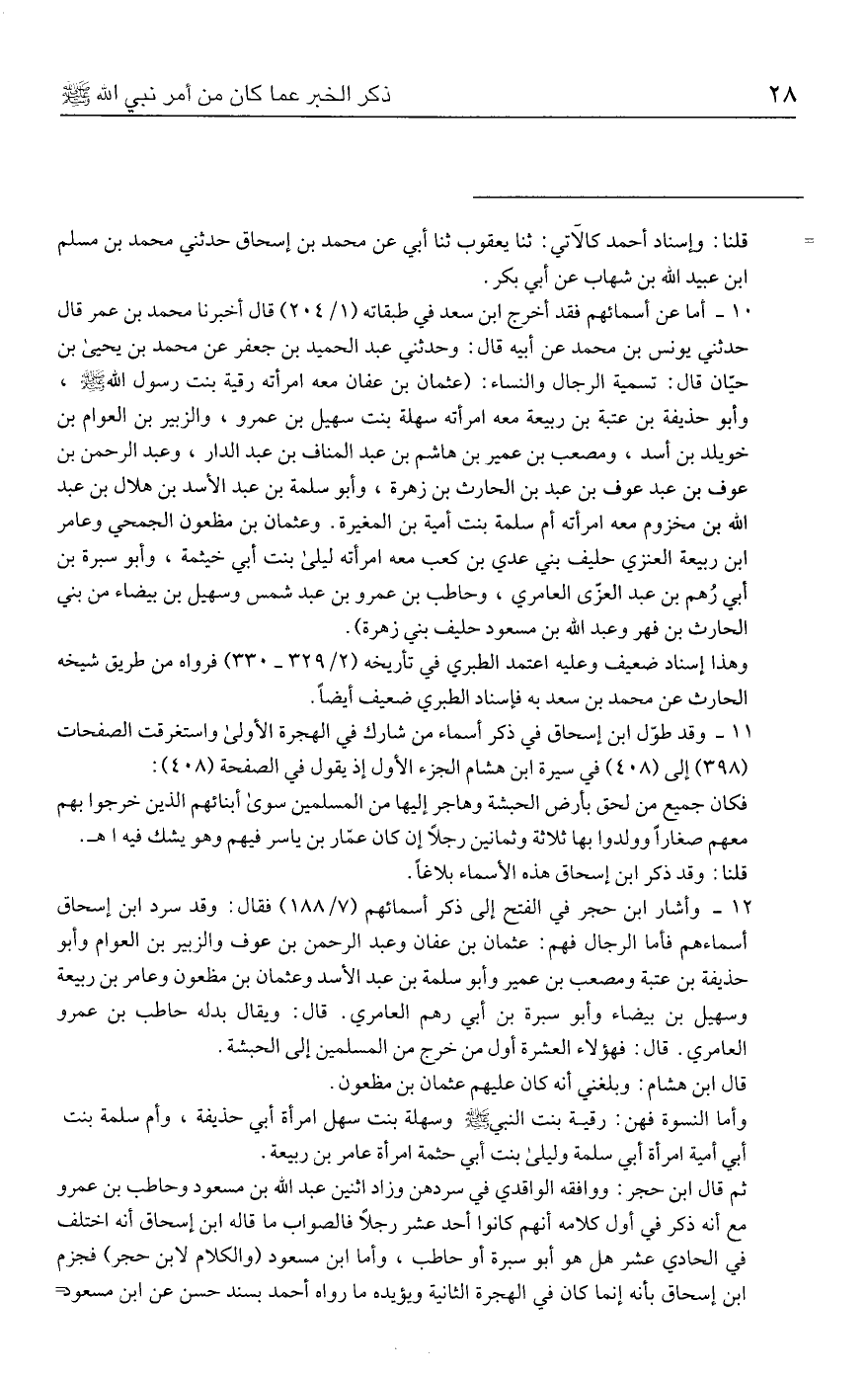 ١١ - وقد طوّل ابن إسحاق في ذكر أسماء من شارك في الهجرة الأولى واستغرقت الصفحات (٣٩٨) إلى (٤٠٨) في سيرة ابن هشام الجزء الأول إذ يقول في الصفحة (٤٠٨):