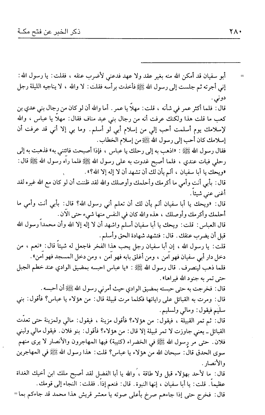 قال العباس: قلت: ويحك يا أبا سفيان أسلم واشهد أن لا إله إلا الله وأن محمدًا رسول الله قبل أن يضرب عنقك. قال؛ فتشهد شهادة الحق وأسلم.