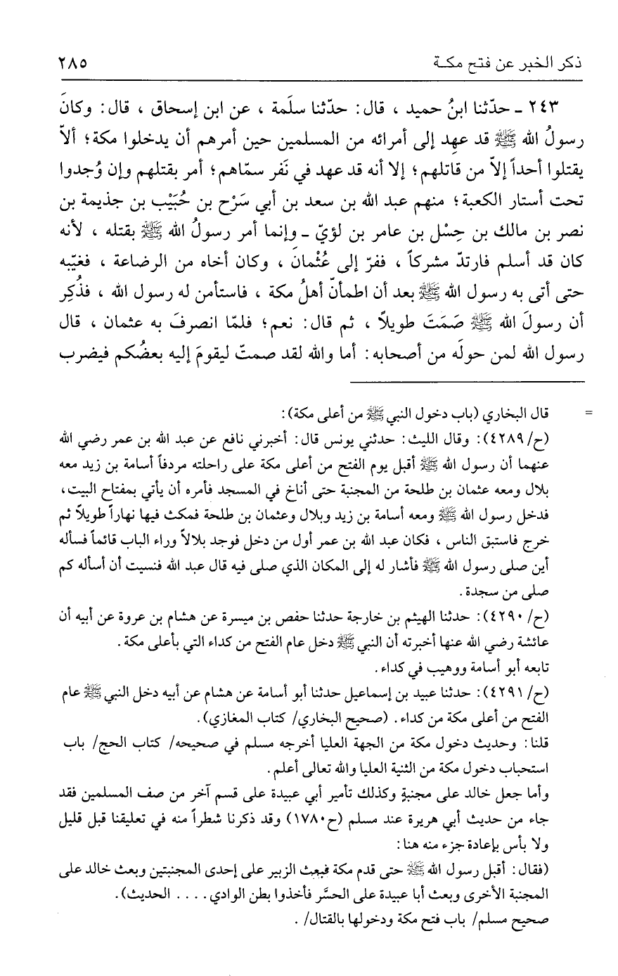 ٢٤٣ - حدَّثنا ابنُ حميد، قال: حدَّثنا سلَمة، عن ابن إسحاق، قال: وكانَ رسولُ الله - صلى الله عليه وسلم - قد عهِد إلي أمرائه من المسلمين حين أمرهم أن يدخلوا مكة؛ ألّا يقتلوا أحدًا إلّا من قاتلهم؛ إلا أنه قد عهد في نَفر سمّاهم؛ أمر بقتلهم وإن وُجدوا تحت أستار الكعبة؛ منهم عبد الله بن سعد بن أبي سَرْح بن حُبَيب بن جذيمة بن نصر بن مالك بن حِسْل بن عامر بن لؤيّ- وإنما أمر رسولُ الله - صلى الله عليه وسلم - بقتله، لأنه كان قد أسلم فارتدّ مشركًا، ففرّ إلي عُثْمان، وكان أخاه من الرضاعة، فغيّبه حتى أتي به رسول الله - صلى الله عليه وسلم - بعد أن اطمأنّ أهلُ مكة، فاستأمن له رسول الله، فذُكِر أن رسولَ الله - صلى الله عليه وسلم - صَمَتَ طويلًا، ثم قال: نعم، فلمّا انصرفَ به عثمان، قال رسول الله لمن حولَه من أصحابه: أما والله لقد صمتّ ليقومَ إليه بعضُكم فيضرب
