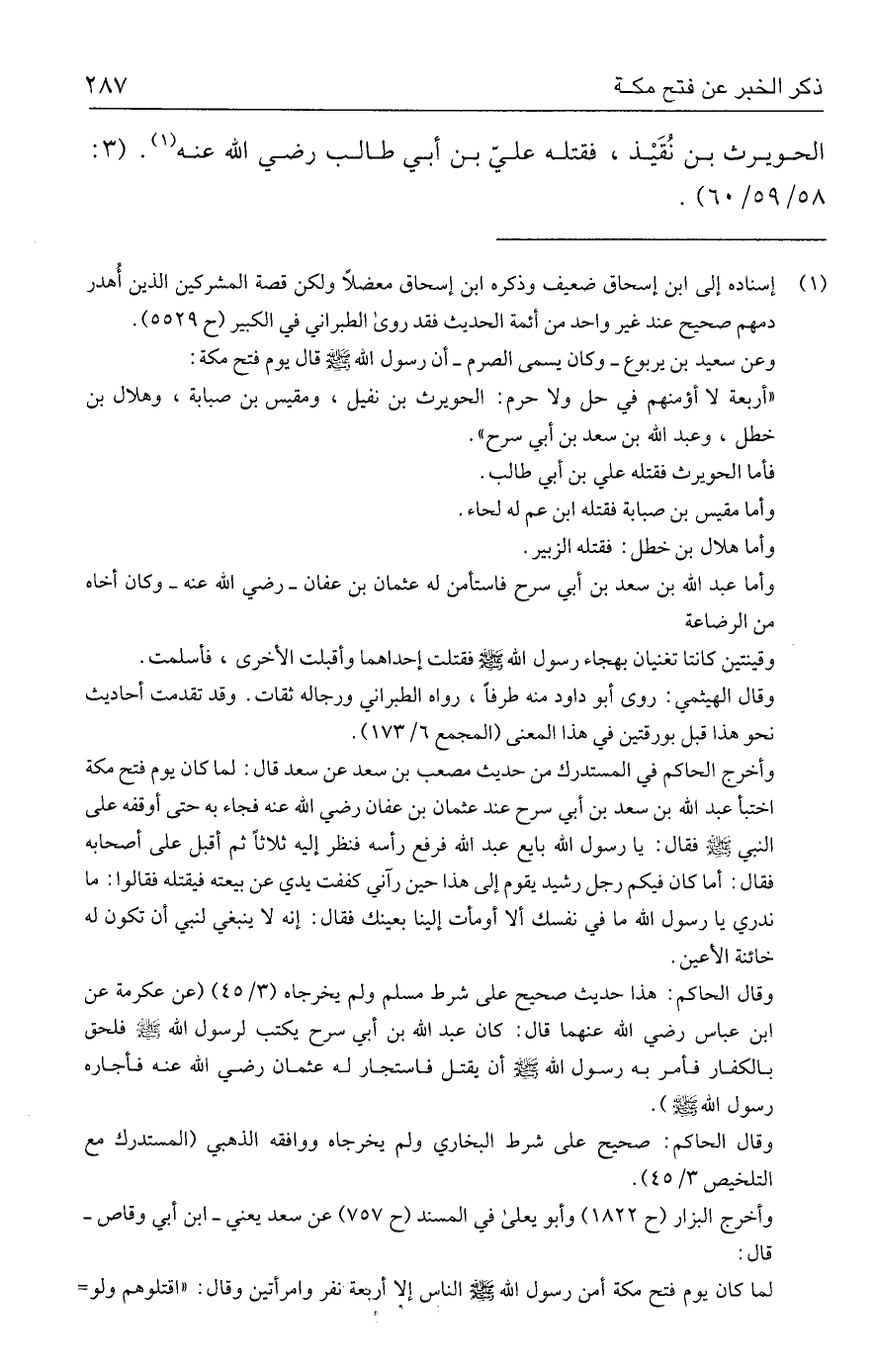 (١) إسناده إلي ابن إسحاق ضعيف وذكره ابن إسحاق معضلًا ولكن قصة المشركين الذين أُهدر دمهم صحيح عند غير واحد من أئمة الحديث فقد روي الطبراني في الكبير (ح ٥٥٢٩).