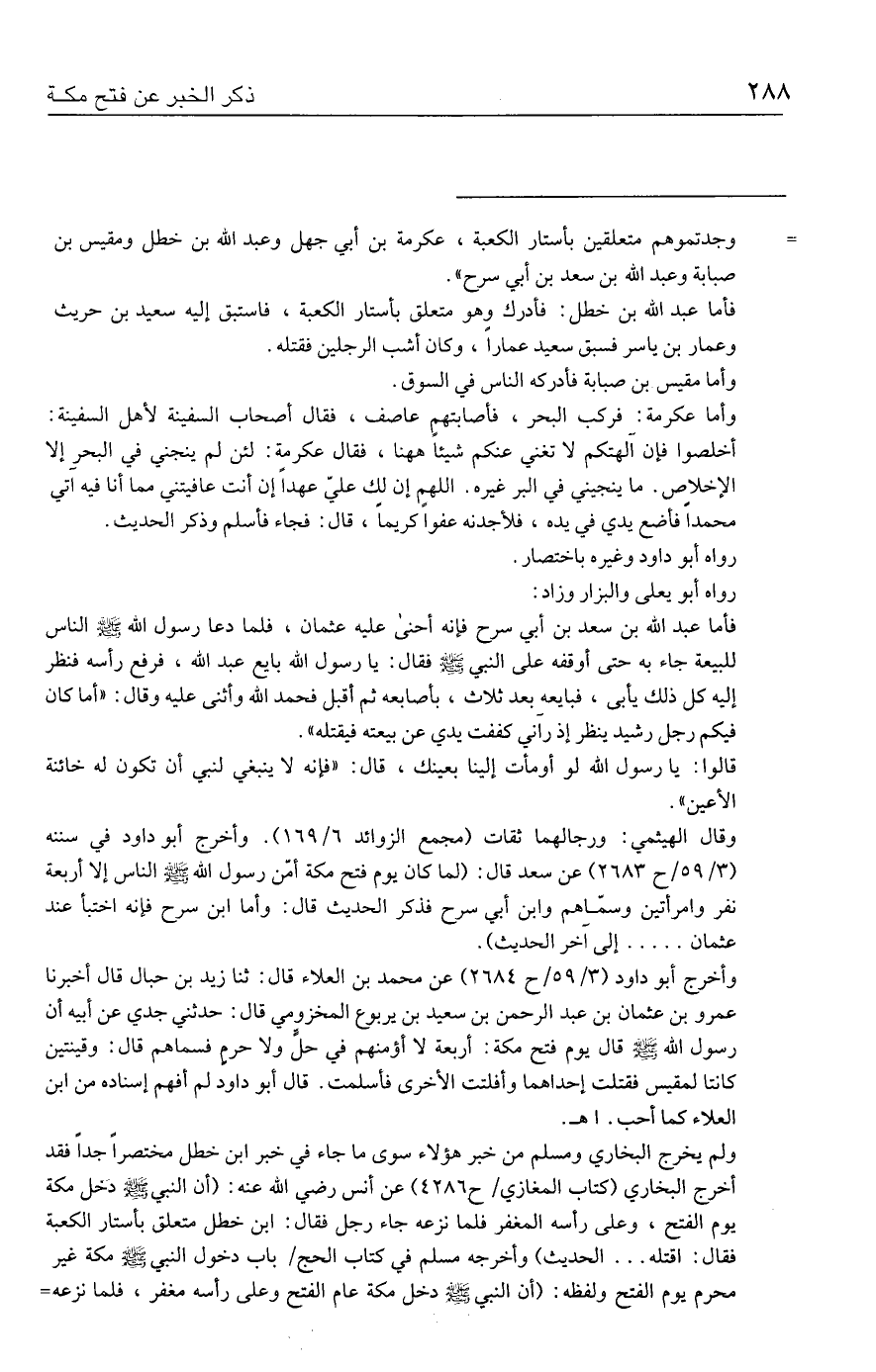 وأخرج أبو داود (٣/ ٥٩ / ح ٢٦٨٤) عن محمد بن العلاء قال: ثنا زيد بن حبال قال أخبرنا عمرو بن عثمان بن عبد الرحمن بن سعيد بن يربوع المخزومي قال: حدثني جدي عن أبيه أن رسول الله - صلى الله عليه وسلم - قال يوم فتح مكة: أربعة لا أؤمنهم في حلٍّ ولا حرمٍ فسماهم قال: وقينتين كانتا لمقيس فقتلت إحداهما وأفلتت الأخرى فأسلمت. قال أبو داود لم أفهم إسناده من ابن العلاء كما أحب. اهـ.