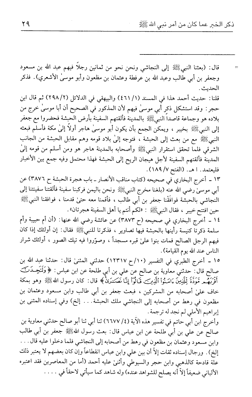 ١٣ - أخرج البخاري في صحيحه (كتاب مناقب الأنصار -باب هجرة الحبشة ح ٣٨٧٦) عن أبي موسى رضي الله عنه (بلغنا مخرج النبي - صلى الله عليه وسلم - ونحن باليمن فركبنا سفينة فألقتنا سفينتنا إلى النجاشي بالحبشة فوافَقْنا جعفر بن أبي طالب، فأقمنا معه حتى قدمنا، فوافقنا النبي - صلى الله عليه وسلم - حين افتتح خيبر، فقال النبي - صلى الله عليه وسلم -: "لكم أنتم يا أهل السفينة هجرتان".