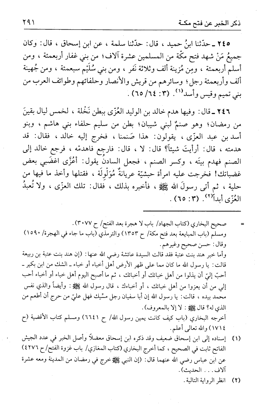 ٢٤٥ - حدَّثنا ابنُ حميد، قال: حدَّثنا سلمة، عن ابن إسحاق، قال: وكان جميعُ مَنْ شهد فتح مكّة من المسلمين عشرة آلاف؛ من بني غفار أربعمئة، ومن أسلم أربعمئة، ومِن مُزينة ألف وثلاثة نَفر، ومن بني سُلَيم سبعمئة، ومن جُهينة ألف وأربعمئة رجل؛ وسائرهم من قريش والأنصار وحلفائهم وطوائف العرب من بني تميم وقيس وأسد (١). (٣: ٦٤/ ٦٥).