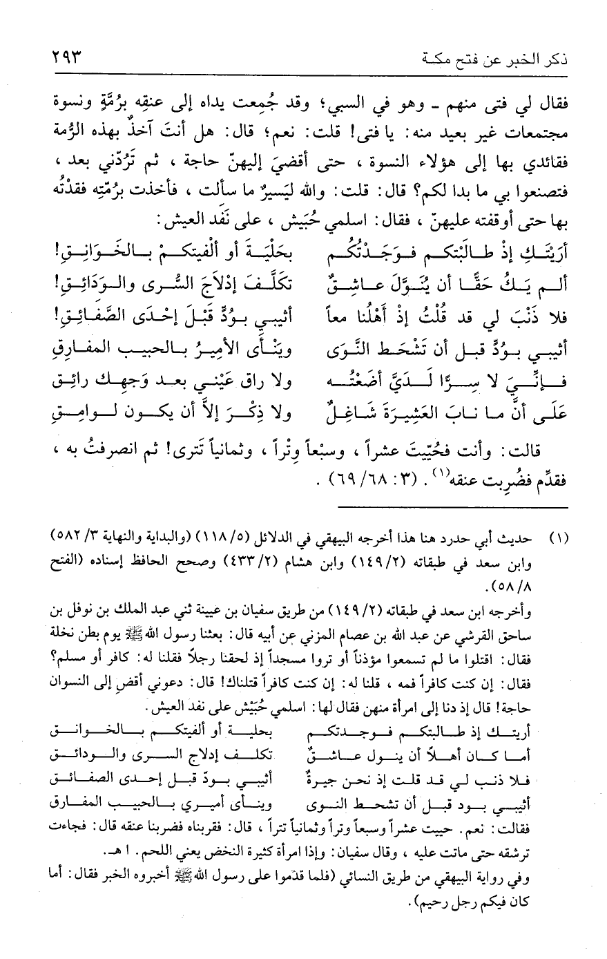 فقال لي فتي منهم- وهو في السبي؛ وقد جُمِعت يداه إلي عنقِه برُمَّةٍ ونسوة مجتمعات غير بعيد منه: يا فتي! قلت: نعم؛ قال: هل أنتَ آخذٌ بهذه الرُّمة فقائدي بها إلى هؤلاء النسوة، حتى أقضيَ إليهنّ حاجة، ثم تَرُدّني بعد، فتصنعوا بي ما بدا لكم؟ قال: قلت: والله ليَسيرٌ ما سألت، فأخذت برُمّتِه فقدْتُه بها حتى أوقفته عليهنّ، فقال: اسلمي حُبَيش، علي نَفَد العيش: