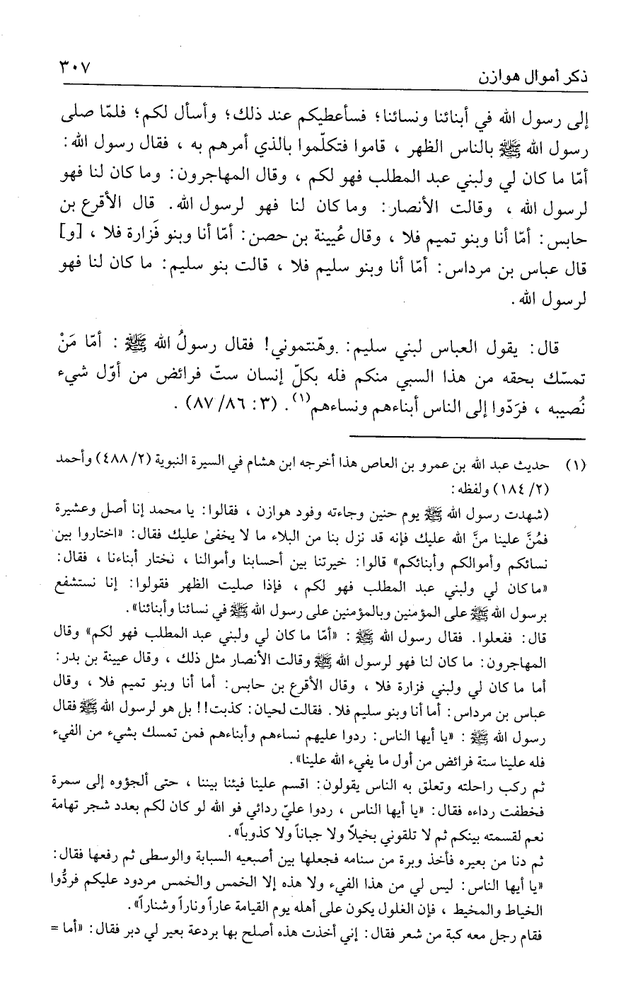 قال: يقول العباس لبني سليم: . وهّنتموني! فقال رسولُ الله - صلى الله عليه وسلم -: أمّا مَنْ تمسّك بحقه من هذا السبي منكم فله بكلّ إنسان ستّ فرائض من أوّل شيء نُصيبه، فرَدّوا إلى الناس أبناءهم ونساءهم (١). (٣: ٨٦/ ٨٧).