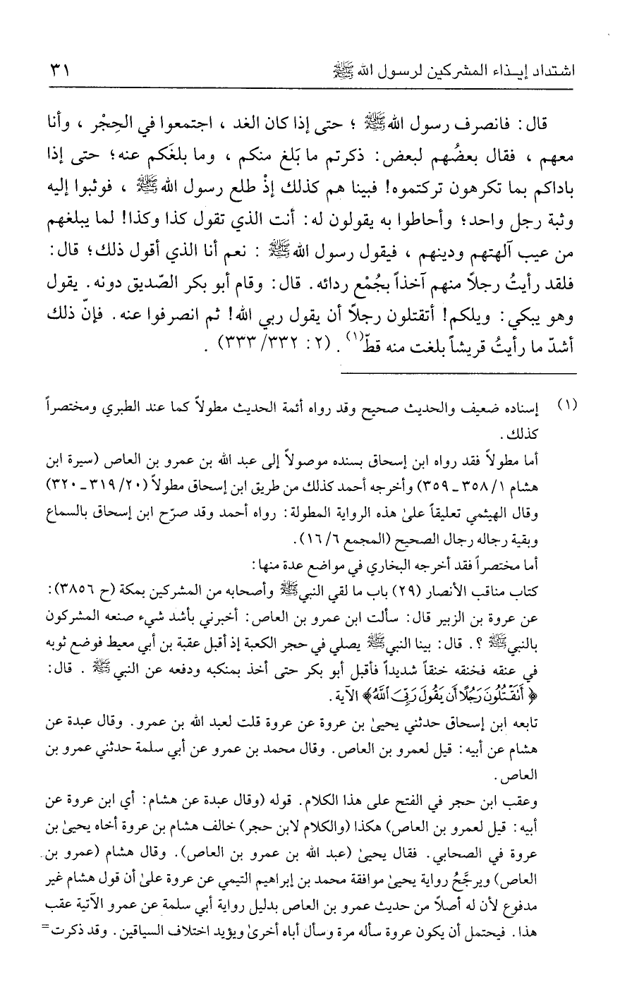 أما مطولًا فقد رواه ابن إسحاق بسنده موصولًا إلى عبد الله بن عمرو بن العاص (سيرة ابن هشام ١/ ٣٥٨ - ٣٥٩) وأخرجه أحمد كذلك من طريق ابن إسحاق مطولًا (٢٠/ ٣١٩ - ٣٢٠) وقال الهيثمي تعليقًا على هذه الرواية المطولة: رواه أحمد وقد صرّح ابن إسحاق بالسماع وبقية رجاله رجال الصحيح (المجمع ٦/ ١٦).