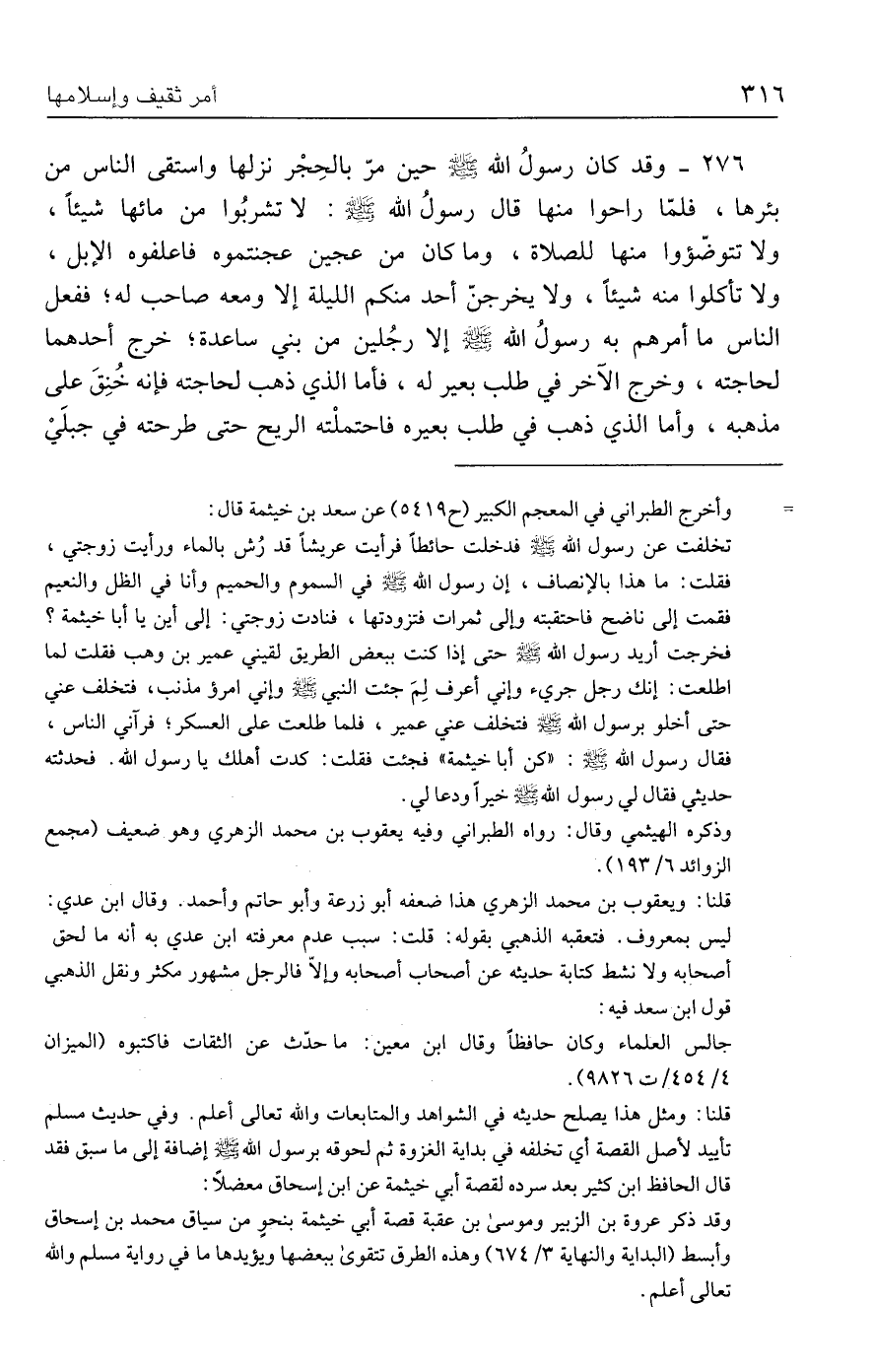 ٢٧٦ - وقد كان رسولُ الله - صلى الله عليه وسلم - حين مرّ بالحِجْر نزلها واستقى الناس من بئرها، فلمّا راحوا منها قال رسولُ الله - صلى الله عليه وسلم -: لا تشربُوا من مائها شيئًا، ولا تتوضّؤوا منها للصلاة، وما كان من عجين عجنتموه فاعلفوه الإبل، ولا تأكلوا منه شيئًا، ولا يخرجنّ أحد منكم الليلة إلا ومعه صاحب له؛ ففعل الناس ما أمرهم به رسولُ الله - صلى الله عليه وسلم - إلا رجُلين من بني ساعدة؛ خرج أحدهما لحاجته، وخرج الآخر في طلب بعير له، فأما الذي ذهب لحاجته فإنه خُنِقَ على مذهبه، وأما الذي ذهب في طلب بعيره فاحتملْته الريح حتى طرحته في جبلَي
