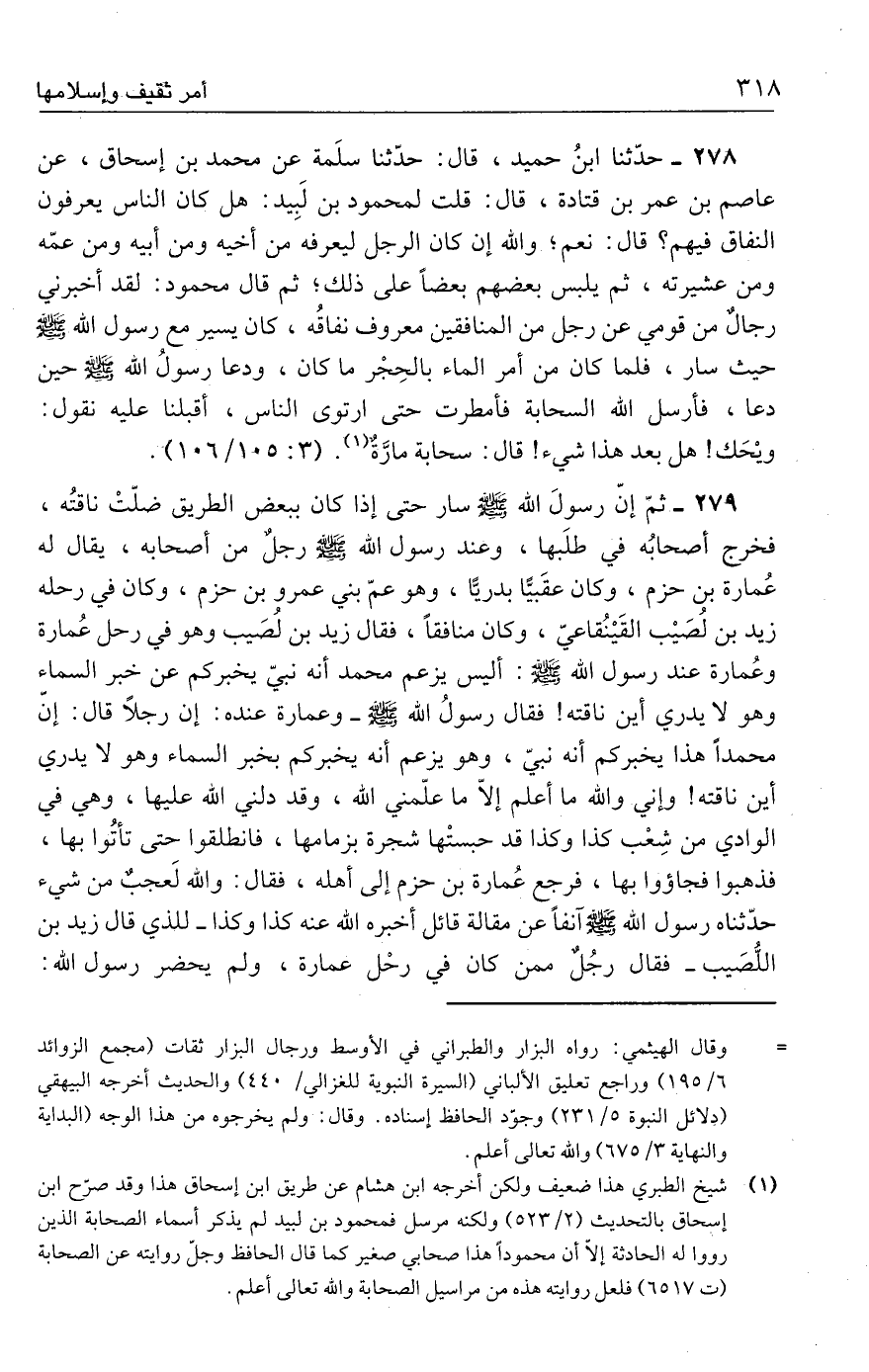 ٢٧٩ - ثمّ إنّ رسولَ الله - صلى الله عليه وسلم - سار حتى إذا كان ببعض الطريق ضلّتْ ناقتُه، فخرج أصحابُه في طلَبها، وعند رسول الله - صلى الله عليه وسلم - رجلٌ من أصحابه، يقال له عُمارة بن حزم، وكان عقَبيًّا بدريًّا، وهو عمّ بني عمرو بن حزم، وكان في رحله زيد بن لُصَيب القَينُقاعيّ، وكان منافقًا، فقال زيد بن لُصَيب وهو في رحل عُمارة وعُمارة عند رسول الله - صلى الله عليه وسلم -: أليس يزعم محمد أنه نبيّ يخبركم عن خبر السماء وهو لا يدري أين ناقته! فقال رسولُ الله - صلى الله عليه وسلم - وعمارة عنده: إن رجلًا قال: إنّ محمدًا هذا يخبركم أنه نبيّ، وهو يزعم أنه يخبركم بخبر السماء وهو لا يدري أين ناقته! وإني والله ما أعلم إلّا ما علّمني الله، وقد دلني الله عليها، وهي في الوادي من شِعْب كذا وكذا قد حبستْها شجرة بزمامها، فانطلقوا حتى تأتُوا بها، فذهبوا فجاؤوا بها، فرجع عُمارة بن حزم إلى أهله، فقال: والله لَعجبٌ من شيء حدّثناه رسول الله - صلى الله عليه وسلم - آنفًا عن مقالة قائل أخبره الله عنه كذا وكذا -للذي قال زيد بن اللُّصَيب- فقال رجُلٌ ممن كان في رحْل عمارة، ولم يحضر رسول الله: