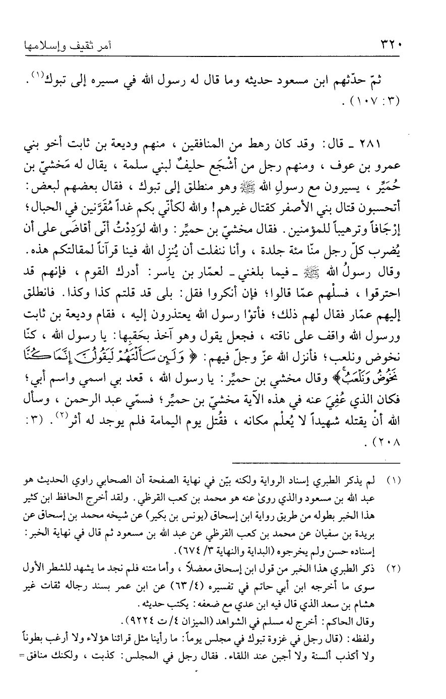 ٢٨١ - قال: وقد كان رهط من المنافقين، منهم وديعة بن ثابت أخو بني عمرو بن عوف، ومنهم رجل من أشْجَع حليفٌ لبني سلمة، يقال له مَخشيّ بن حُمَيِّر، يسيرون مع رسولِ الله - صلى الله عليه وسلم - وهو منطلق إلى تبوك، فقال بعضهم لبعض: أتحسبون قتال بني الأصفر كقتال غيرهم! والله لكأنّي بكم غدًا مُقَرَّنين في الحبال؛ إرْجَافًا وترهيبًا للمؤمنين. فقال مخشيّ بن حميِّر: والله لوَدِدْتُ أنّى أقاضَى على أن يُضرب كلّ رجل منّا مئة جلدة، وأنا ننفلت أن يُنزِل الله فينا قرآنًا لمقالتكم هذه. وقال رسولُ الله - صلى الله عليه وسلم - فيما بلغني- لعمّار بن ياسر: أدرك القوم، فإنهم قد احترقوا، فسلْهم عمّا قالوا؛ فإن أنكروا فقل: بلى قد قلتم كذا وكذا. فانطلق إليهم عمّار فقال لهم ذلك، فأتوْا رسول الله يعتذرون إليه، فقام وديعة بن ثابت ورسول الله واقف على ناقته، فجعل يقول وهو آخذ بحَقبِها: يا رسول الله، كنّا نخوض ونلعب؛ فأنزل الله عزّ وجلّ فيهم: {وَلَئِنْ سَأَلْتَهُمْ لَيَقُولُنَّ إِنَّمَا كُنَّا نَخُوضُ وَنَلْعَبُ} وقال مخشي بن حميِّر: يا رسول الله، قعد بي اسمي واسم أبي؛ فكان الذي عُفِيَ عنه في هذه الآية مخشيّ بن حميِّر، فسمّي عبد الرحمن، وسأل الله أنْ يقتله شهيدًا لا يُعلم مكانه، فقُتل يوم اليمامة فلم يوجد له أثر (٢). (٣: ٢٠٨).