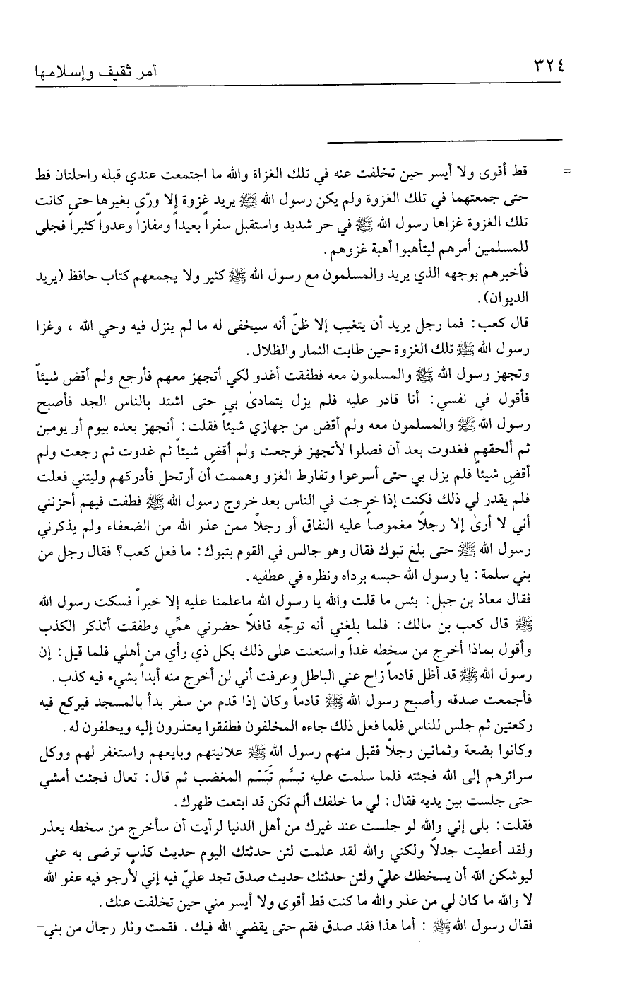 فقلت: بلى إني والله لو جلست عند غيرك من أهل الدنيا لرأيت أن سأخرج من سخطه بعذر ولقد أعطيت جدلًا ولكني والله لقد علمت لئن حدثتك اليوم حديث كذب ترضى به عني ليوشكن الله أن يسخطك عليّ ولئن حدثتك حديث صدق تجد عليّ فيه إني لأرجو فيه عفو الله لا والله ما كان لي من عذر والله ما كنت قط أقوى ولا أيسر مني حين تخلفت عنك.