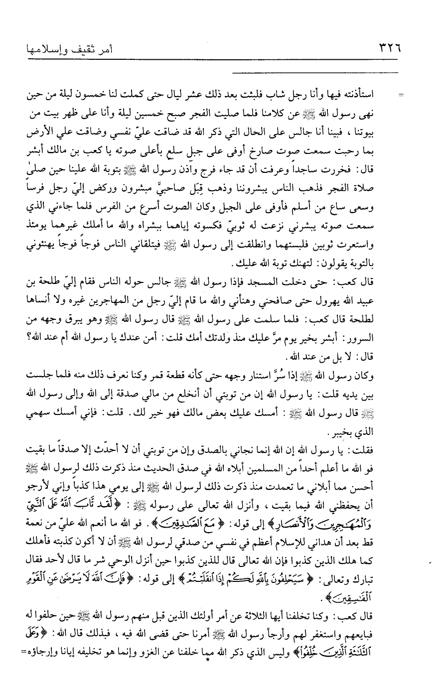 = استأذنته فيها وأنا رجل شاب فلبثت بعد ذلك عشر ليال حتى كملت لنا خمسون ليلة من حين نهى رسول الله - صلى الله عليه وسلم - عن كلامنا فلما صليت الفجر صبح خمسين ليلة وأنا على ظهر بيت من بيوتنا، فبينا أنا جالس على الحال التي ذكر الله قد ضاقت عليّ نفسي وضاقت علي الأرض بما رحبت سمعت صوت صارخ أوفى على جبل سلعٍ بأعلى صوته يا كعب بن مالك أبشر قال: فخررت ساجدًا وعرفت أن قد جاء فرج وآذن رسول الله - صلى الله عليه وسلم - بتوبة الله علينا حين صلى صلاة الفجر فذهب الناس يبشروننا وذهب قِبَل صاحبيَّ مبشرون وركض إليّ رجل فرسًا وسعى ساعٍ من أسلم فأوفى على الجبل وكان الصوت أسرع من الفرس فلما جاءني الذي سمعت صوته يبشرني نزعت له ثوبيّ فكسوته إياهما ببشراه والله ما أملك غيرهما يومئذ واستعرت ثوبين فلبستهما وانطلقت إلى رسول الله - صلى الله عليه وسلم - فيتلقاني الناس فوجًا فوجًا يهنئوني بالتوبة يقولون: لتهنك توبة الله عليك.