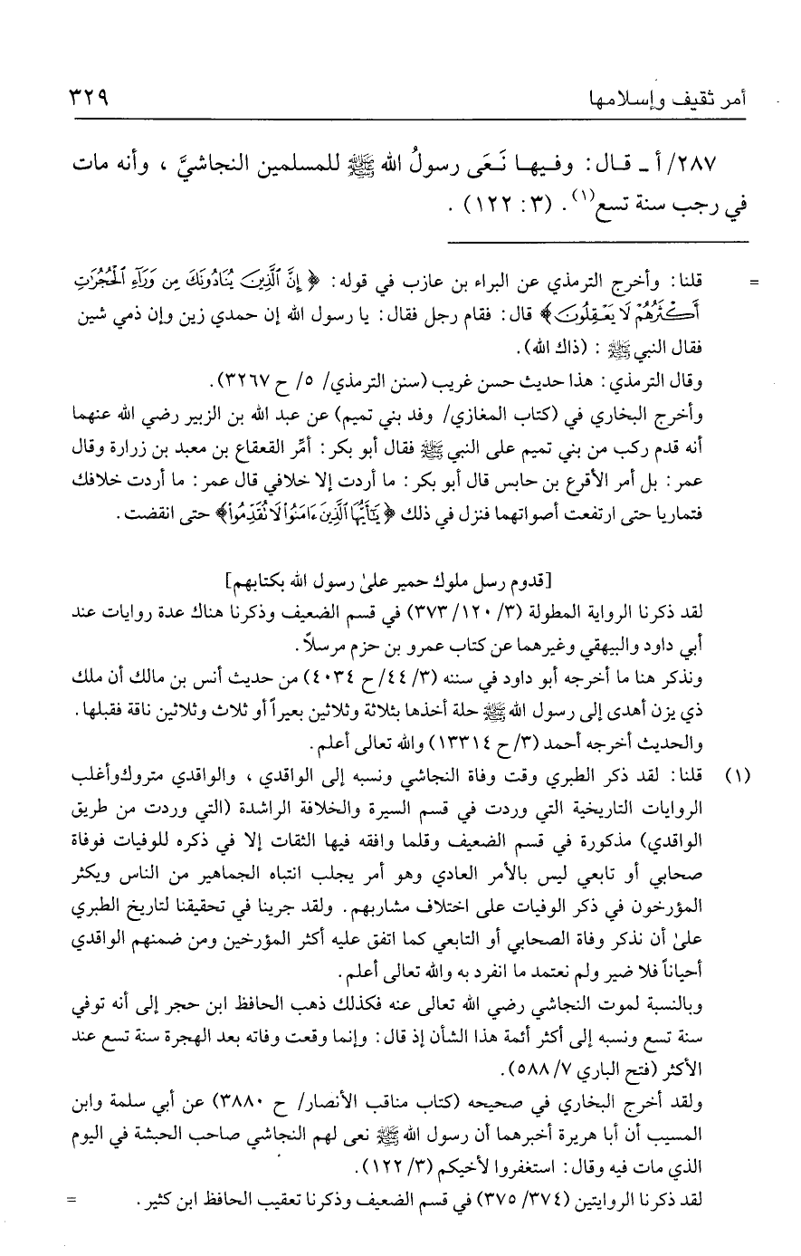 (١) قلنا: لقد ذكر الطبري وقت وفاة النجاشي ونسبه إلى الواقدي، والواقدي متروك وأغلب الروايات التاريخية التي وردت في قسم السيرة والخلافة الراشدة (التي وردت من طريق الواقدي) مذكورة في قسم الضعيف وقلما وافقه فيها الثقات إلا في ذكره للوفيات فوفاة صحابي أو تابعي ليس بالأمر العادي وهو أمر يجلب انتباه الجماهير من الناس ويكثر المؤرخون في ذكر الوفيات على اختلاف مشاربهم. ولقد جرينا في تحقيقنا لتاريخ الطبري على أن نذكر وفاة الصحابي أو التابعي كما اتفق عليه أكثر المؤرخين ومن ضمنهم الواقدي أحيانًا فلا ضير ولم نعتمد ما انفرد به والله تعالى أعلم.