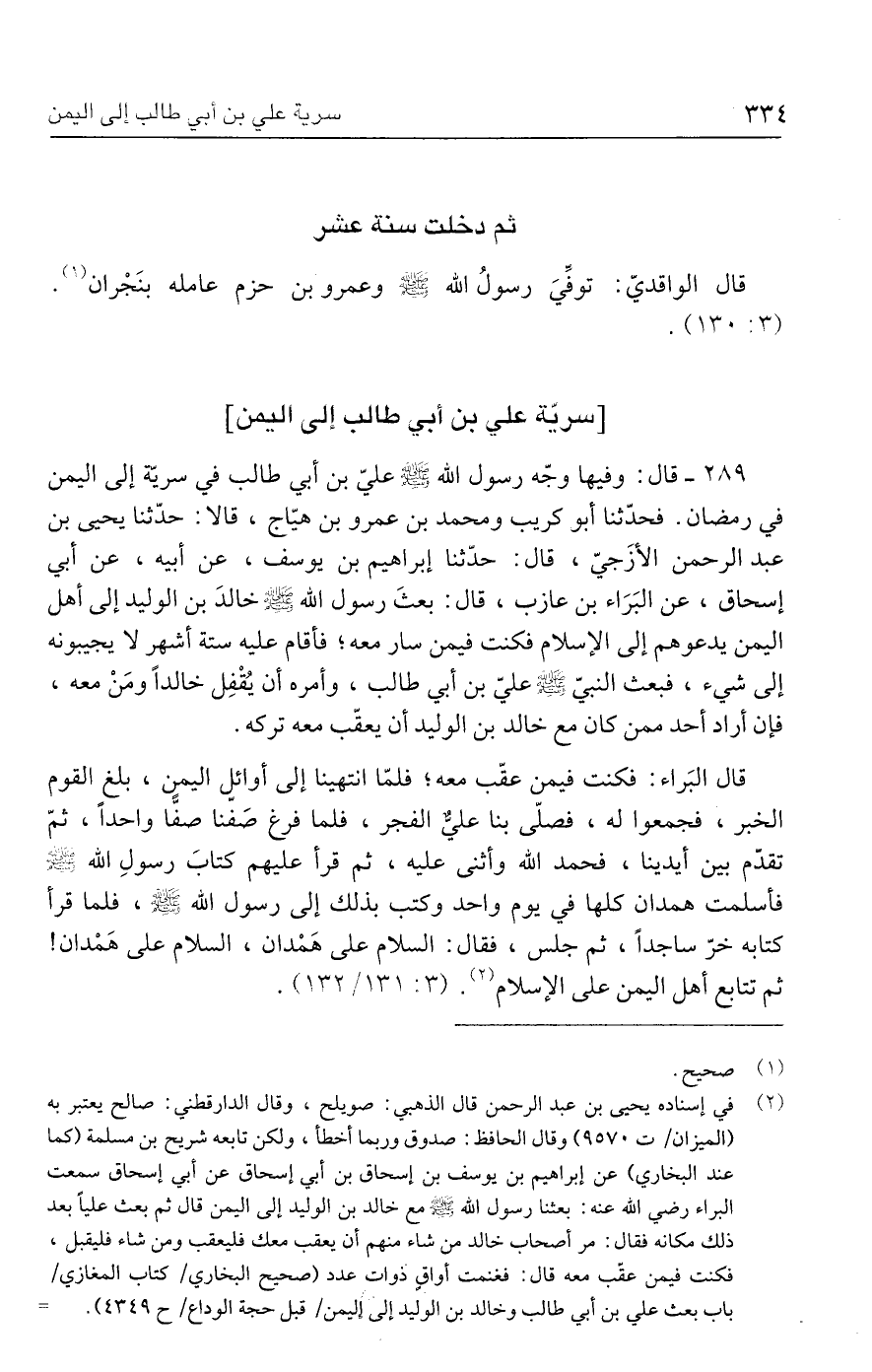 ٢٨٩ - قال: وفيها وجّه رسول الله - صلى الله عليه وسلم - عليّ بن أبي طالب في سريّة إلى اليمن في رمضان. فحدّثنا أبو كريب ومحمد بن عمرو بن هيّاج، قالا: حدَّثنا يحيى بن عبد الرحمن الأزَجيّ، قال: حدَّثنا إبراهيم بن يوسف، عن أبيه، عن أبي إسحاق، عن البَرَاء بن عازب، قال: بعثَ رسول الله - صلى الله عليه وسلم - خالدَ بن الوليد إلى أهل اليمن يدعوهم إلى الإسلام فكنت فيمن سار معه؛ فأقام عليه ستة أشهر لا يجيبونه إلى شيء، فبعث النبيّ - صلى الله عليه وسلم - عليّ بن أبي طالب، وأمره أن يُقْفِل خالدًا ومَنْ معه، فإن أراد أحد ممن كان مع خالد بن الوليد أن يعقّب معه تركه.