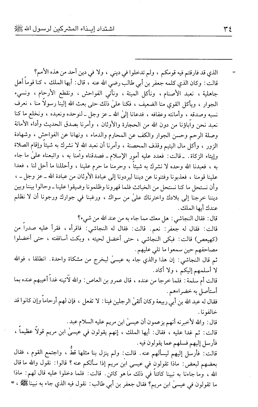 = الذي قد فارقتم فيه قومكم، ولم تدخلوا في ديني، ولا في دين أحد من هذه الأمم؟ قالت: وكان الذي كلمه جعفر بن أبي طالب رضي الله عنه، قال: أيها الملك، كنا قومًا أهل جاهلية، نعبد الأصنام، ونأكل الميتة، ونأتي الفواحش، ونقطع الأرحام، ونسيء الجوار، ويأكل القوي منا الضعيف، فكنا على ذلك حتى بعث الله إلينا رسولًا منا، نعرف نسبه وصدقه، وأمانته وعفافه، فدعانا إلى الله -عزَّ وجلَّ- لنوحده ونعبده، ونخلع ما كنا نعبد نحن وآباؤنا من دون الله من الحجارة والأوثان، وأمرنا بصدق الحديث وأداء الأمانة وصلة الرحم وحسن الجوار والكف عن المحارم والدماء، ونهانا عن الفواحش، وشهادة الزور، وأكل مال اليتيم وقذف المحصنة، وأمرنا أن نعبد الله لا نشرك به شيئًا وإقام الصلاة وإيتاء الزكاة. -قالت: فعدد عليه أمور الإسلام- فصدقناه وآمنا به، واتبعناه على ما جاء به، فعبدنا الله وحده لا نشرك به شيئًا، وحرمنا ما حرم علينا، وأحللنا ما أحل لنا، فعدا علينا قومنا، فعذبونا وفتنونا عن ديننا ليردونا إلى عبادة الأوثان من عبادة الله -عزَّ وجلَّ-، وأن نستحل ما كنا نستحل من الخبائث فلما قهرونا وظلمونا وضيقوا علينا -وحالوا بيننا وبين ديننا خرجنا إلى بلادك واخترناك على من سواك، ورغبنا في جوارك ورجونا أن لا نظلم عندك أيها الملك.