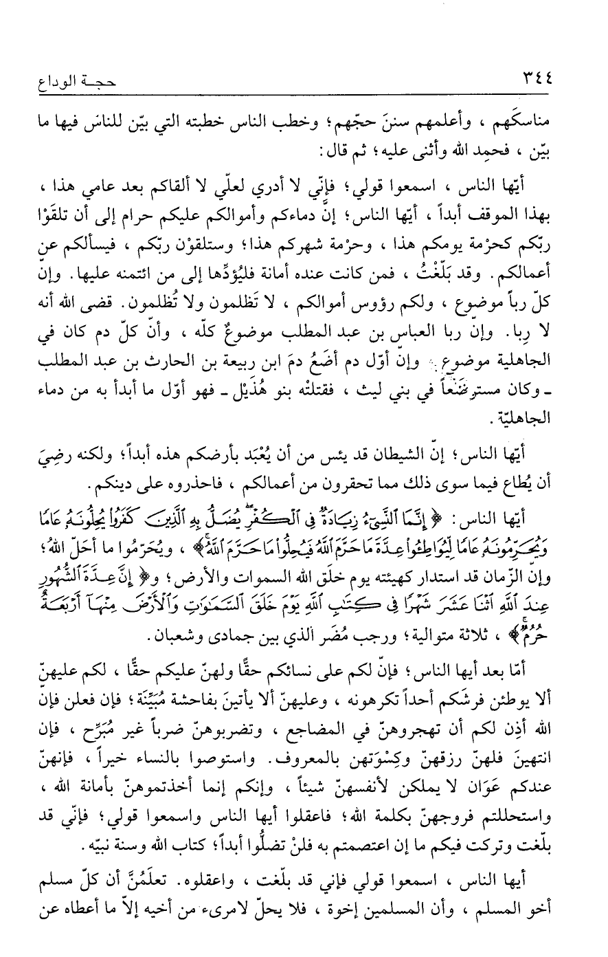 أيّها الناس، اسمعوا قولي؛ فإنّي لا أدري لعلّي لا ألقاكم بعد عامي هذا، بهذا الموقف أبدًا، أيّها الناس؛ إنَّ دماءكم وأموالكم عليكم حرام إلى أن تلقَوْا ربّكم كحرْمة يومكم هذا، وحرْمة شهركم هذا، وستلقوْن ربّكم، فيسألكم عن أعمالكم. وقد بَلّغْتُ، فمن كانت عنده أمانة فليُؤدِّها إلى من ائتمنه عليها. وإنّ كلّ ربًا موضوع، ولكم رؤوس أموالكم، لا تَظلمون ولا تُظلمون. قضى الله أنه لا رِبا. وإنّ ربا العباس بن عبد المطلب موضوعٌ كلّه، وأنّ كلّ دم كان في الجاهلية موضوع. وإنّ أوّل دم أضَعُ دمَ ابن رِبيعة بن الحارث بن عبد المطلب -وكان مستوضَعًا في بني ليث، فقتلتْه بنو هُذيل- فهو أوّل ما أبدأ به من دماء الجاهليّة.