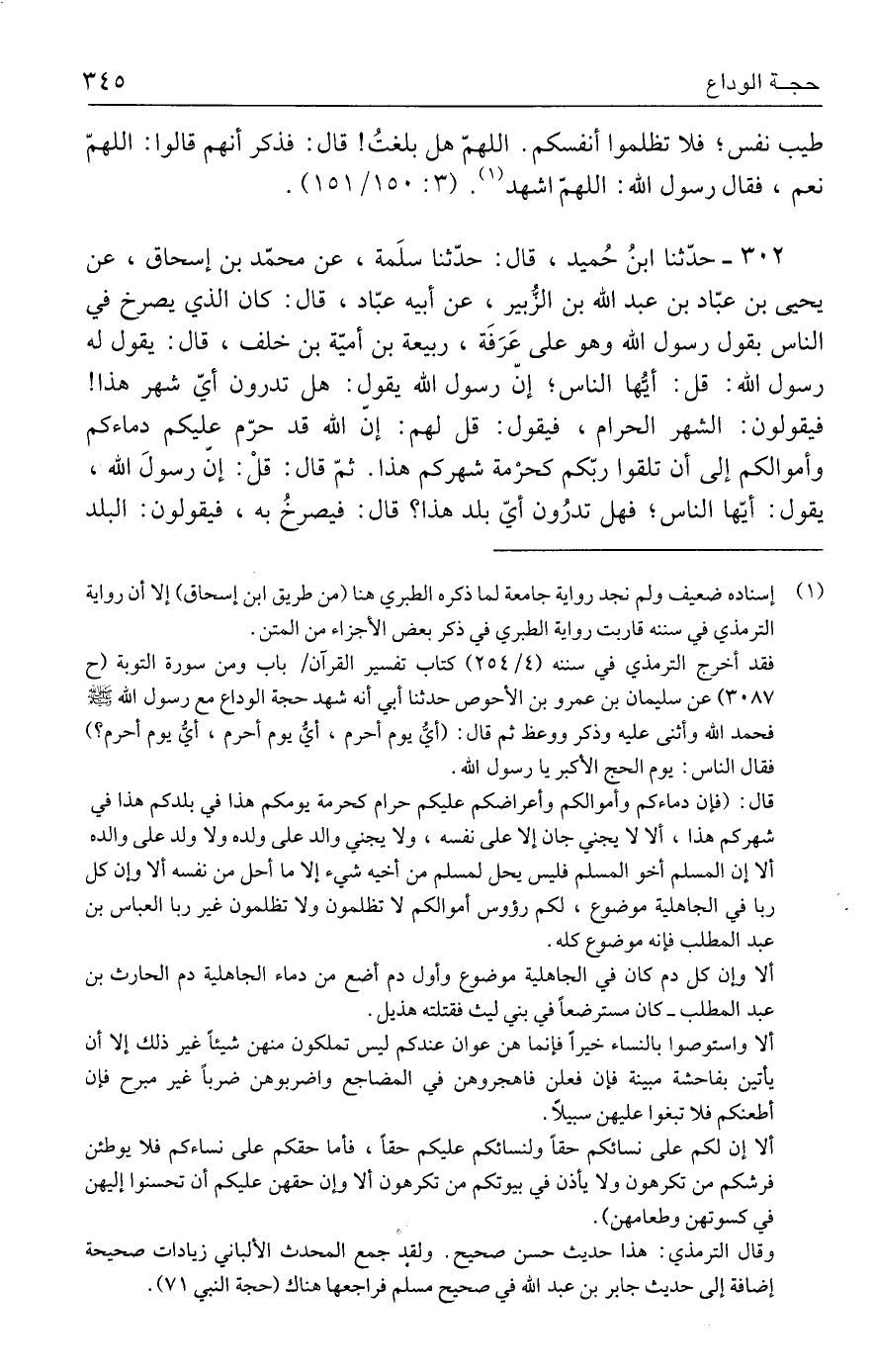 ٣٠٢ - حدَّثنا ابنُ حُميد، قال: حدَّثنا سلَمة، عن محمّد بن إسحاق، عن يحيى بن عبّاد بن عبد الله بن الزُّبير، عن أبيه عبّاد، قال: كان الذي يصرخ في الناس بقول رسول الله وهو على عَرَفَة، ربيعة بن أميّة بن خلف، قال: يقول له رسول الله: قل: أيُّها الناس؛ إنّ رسول الله يقول: هل تدرون أيّ شهر هذا! فيقولون: الشهر الحرام، فيقول: قل لهم: إنّ الله قد حرّم عليكم دماءكم وأموالكم إلى أن تلقوا ربّكم كحرْمة شهركم هذا. ثمّ قال: قلْ: إنّ رسولَ الله، يقول: أيّها الناس؛ فهل تدرُون أيّ بلد هذا؟ قال: فيصرخُ به، فيقولون: البلد