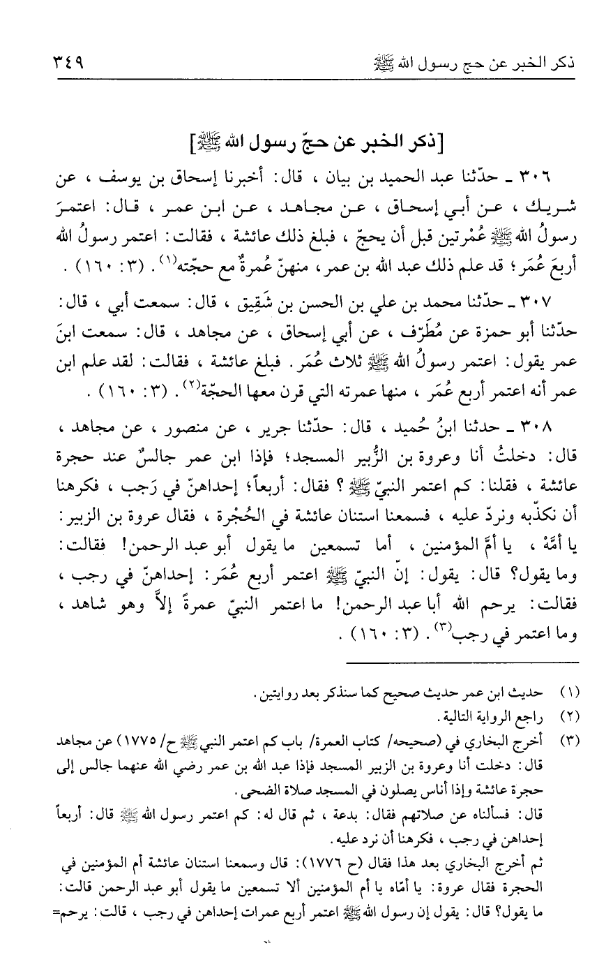 ٣٠٨ - حدثنا ابنُ حُميد، قال: حدَّثنا جرير، عن منصور، عن مجاهد، قال: دخلتُ أنا وعروة بن الزُّبير المسجد؛ فإذا ابن عمر جالسٌ عند حجرة عائشة، فقلنا: كم اعتمر النبيّ - صلى الله عليه وسلم -؟ فقال: أربعًا؛ إحداهنّ في رَجب، فكرهنا أن نكذّبه ونردّ عليه، فسمعنا استنان عائشة في الحُجْرة، فقال عروة بن الزبير: يا أمَّهْ، يا أمَّ المؤمنين، أما تسمعين ما يقول أبو عبد الرحمن! فقالت: وما يقول؟ قال: يقول: إنّ النبيّ - صلى الله عليه وسلم - اعتمر أربع عُمَر: إحداهنّ في رجب، فقالت: يرحم الله أبا عبد الرحمن! ما اعتمر النبيّ عمرةً إلَّا وهو شاهد، وما اعتمر في رجب (٣). (٣: ١٦٠).