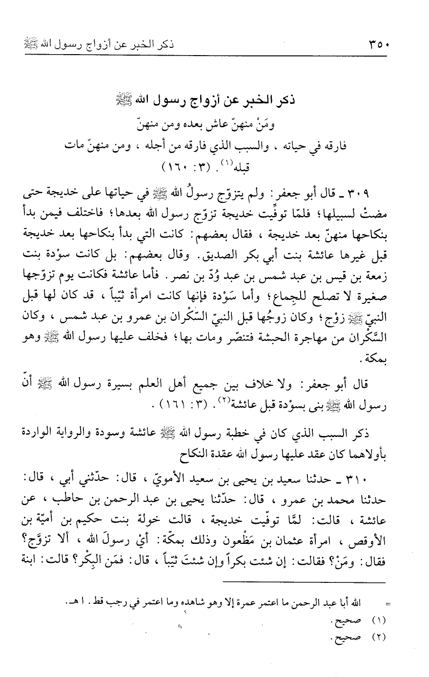 قال أبو جعفر: ولا خلاف بين جميع أهل العلم بسيرة رسول الله - صلى الله عليه وسلم - أنّ رسول الله - صلى الله عليه وسلم - بني بسوْدة قبل عائشة (٢). (٣: ١٦١).
