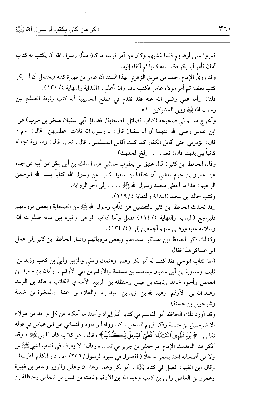 وقد تحدث الحافظ ابن كثير بالتفصيل عن كتّاب رسول الله - صلى الله عليه وسلم - من الصحابة وبعض مروياتهم فليراجع (البداية والنهاية ٤/ ١١٤) فصل وأما كتاب الوحي وغيره بِن يديه صلوات الله وسلامه عليه ورضي عنهم أجمعين إلى (٤/ ١٣٤).