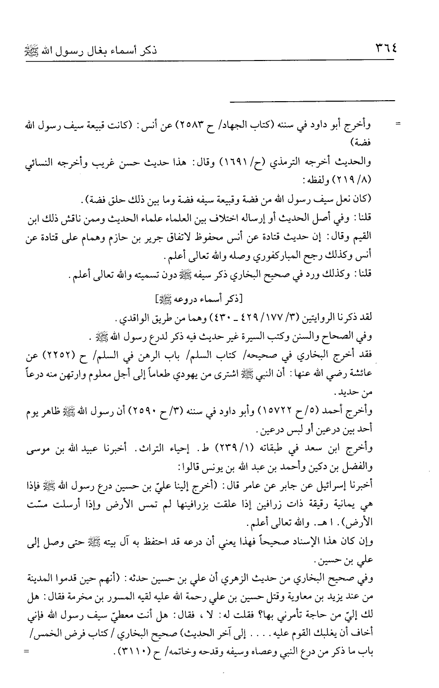 وفي صحيح البخاري من حديث الزهري أن علي بن حسين حدثه: (أنهم حين قدموا المدينة من عند يزيد بن معاوية وقتل حسين بن علي رحمة الله عليه لقيه المسور بن مخرمة فقال: هل لك إليّ من حاجة تأمرني بها؟ فقلت له: لا، فقال: هل أنت معطيّ سيف رسول الله فإني أخاف أن يغلبك القوم عليه ..... إلى آخر الحديث) صحيح البخاري كتاب فرض الخمس باب ما ذكر من درع النبي وعصاه وسيفه وقدحه وخاتمه ح (٣١١٠). =