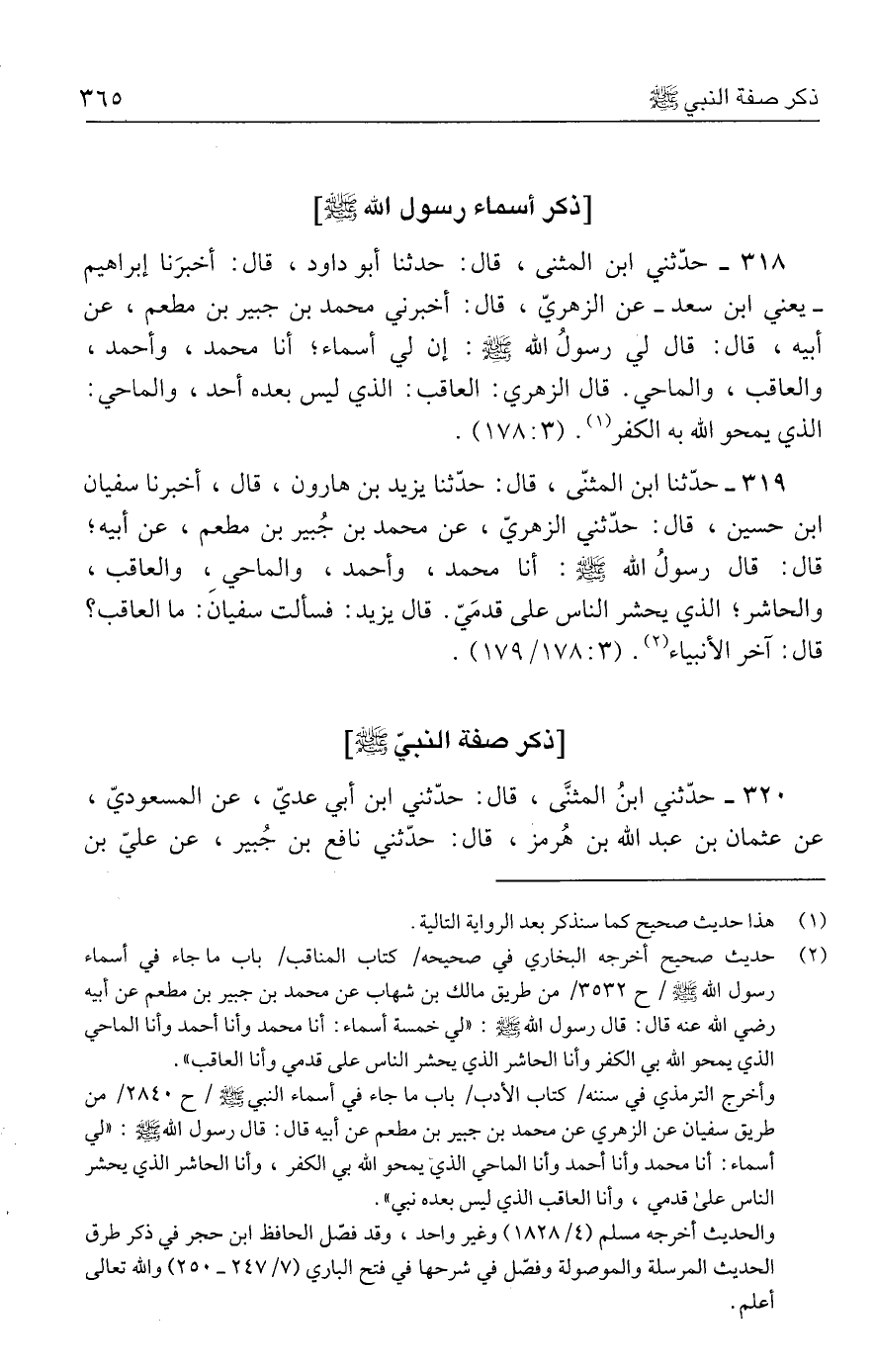 ٣١٩ - حدَّثنا ابن المثنّى، قال: حدَّثنا يزيد بن هارون، قال، أخبرنا سفيان بن حسين، قال: حدّئني الزهريّ، عن محمد بن جُبير بن مطعم، عن أبيه؛ قال: قال رسولُ الله - صلى الله عليه وسلم -: أنا محمد، وأحمد، والماحي، والعاقب، والحاشر؛ الذي يحشر الناس على قدمَيّ. قال يزيد: فسألت سفيان: ما العاقب؟ قال: آخر الأنبياء (٢). (٣: ١٧٨/ ١٧٩).