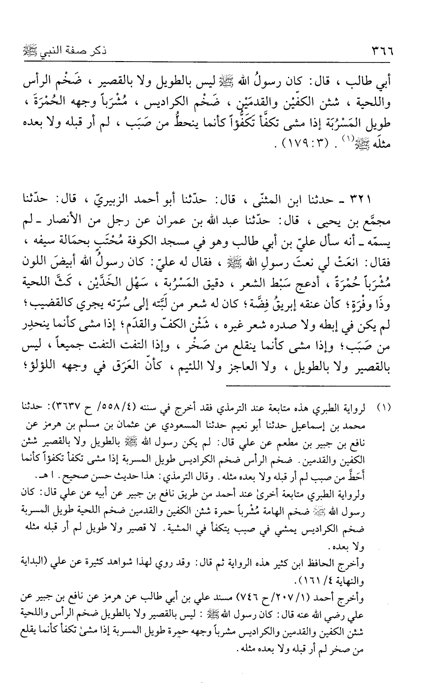 ٣٢١ - حدثنا ابن المثنّى، قال: حدَّثنا أبو أحمد الزبيريّ، قال: حدَّثنا مجمَّع بن يحيى، قال: حدَّثنا عبد الله بن عمران عن رجل من الأنصار -لم يسمّه- أنه سأل عليّ بن أبي طالب وهو في مسجد الكوفة مُحْتَبٍ بحمَالة سيفه، فقال: انعَتْ لي نعتَ رسولِ الله - صلى الله عليه وسلم -، فقال له عليّ: كان رسولُ الله أبيضَ اللون مُشْرَبًا حُمْرَةً، أدعج سَبْط الشعر، دقيق المَسْرُبة، سَهْل الخَدَّين، كَثَّ اللحية وذَا وفْرَةٍ؛ كأن عنقه إبريق فِضَّة؛ كان له شعر من لَبَّته إلى سرّته يجري كالقضيب" لم يكن في إبطه ولا صدره شعر غيره، شَثْن الكفّ والقدَم؛ إذا مشى كأنما ينحدِر من صَبَب؛ وإذا مشى كأنما ينقلع من صَخْر، وإذا التفت التفت جميعًا، ليس بالقصير ولا بالطويل، ولا العاجز ولا اللئيم، كأنّ العَرَق في وجهه اللؤلؤ؛