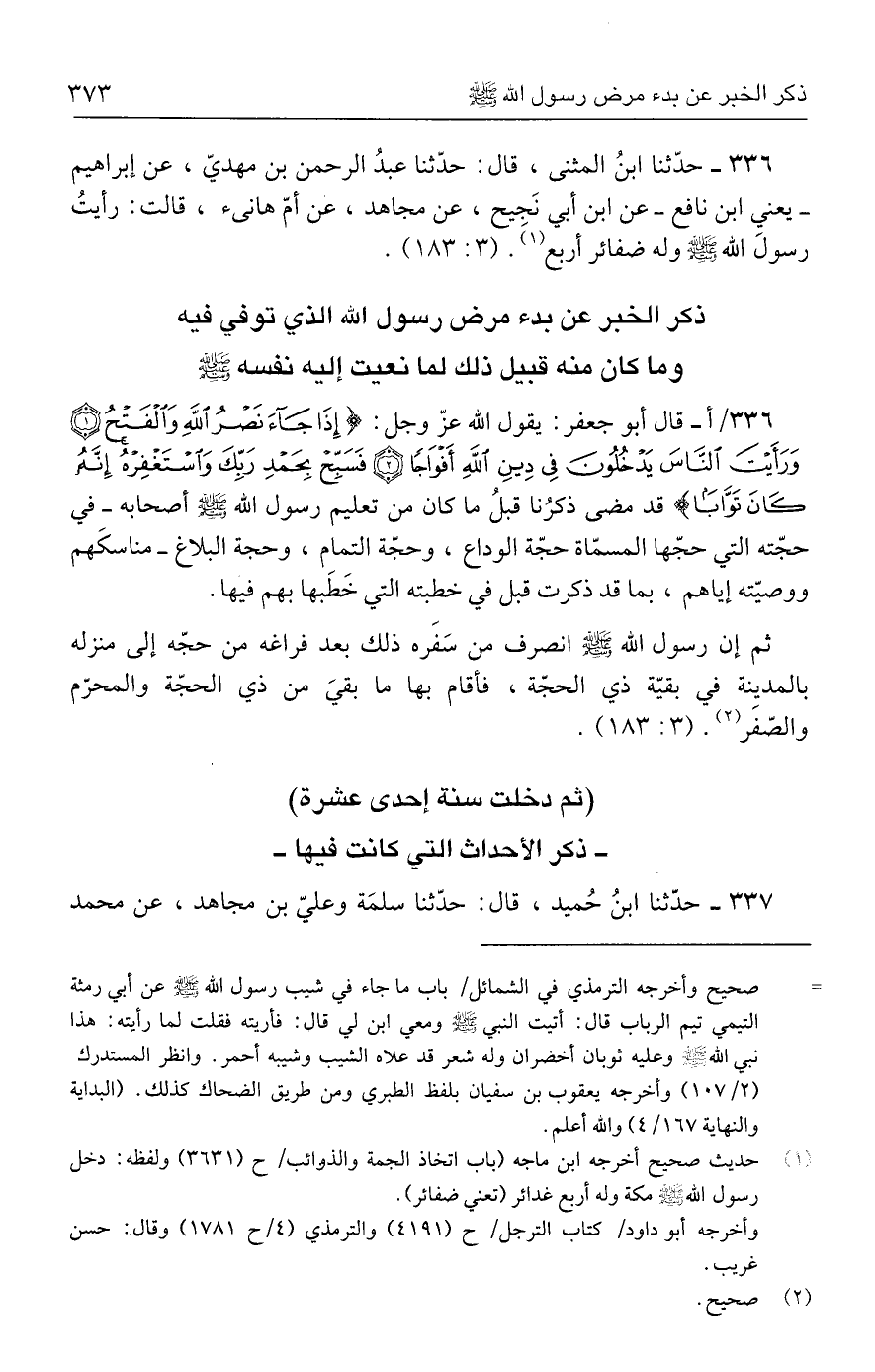 ٣٣٦ / أ- قال أبو جعفر: يقول الله عزّ وجل: {إِذَا جَاءَ نَصْرُ اللَّهِ وَالْفَتْحُ (١) وَرَأَيتَ النَّاسَ يَدْخُلُونَ فِي دِينِ اللَّهِ أَفْوَاجًا (٢) فَسَبِّحْ بِحَمْدِ رَبِّكَ وَاسْتَغْفِرْهُ إِنَّهُ كَانَ تَوَّابًا} قد مضى ذكرُنا قبلُ ما كان من تعليم رسول الله - صلى الله عليه وسلم - أصحابه - في حجّته التي حجّها المسمّاة حجّة الوداع، وحجّة التمام، وحجة البلاع - مناسكَهم ووصيّته إياهم، بما قد ذكرت قبل في خطبته التي خَطَبها بهم فيها.