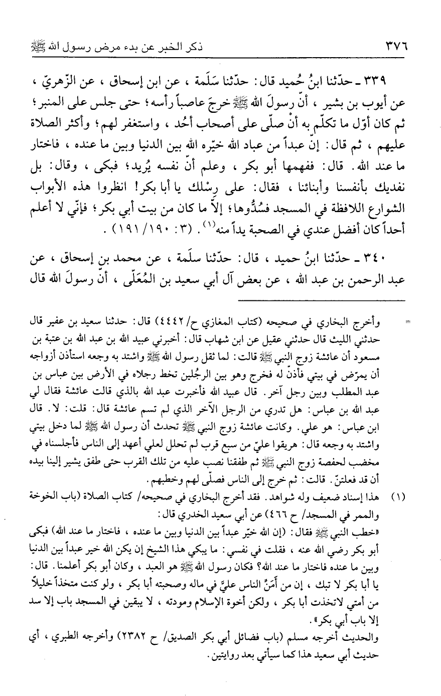 ٣٣٩ - حدَّثنا ابنُ حُميد قال: حدَّثنا سَلَمة، عن ابن إسحاق، عن الزّهريّ، عن أيوب بن بشير، أنّ رسولَ الله - صلى الله عليه وسلم - خرجَ عاصبًا رأسه؛ حتى جلس على المنبر؛ ثم كان أوّل ما تكلّم به أنْ صلّى على أصحاب أحُد، واستغفر لهم؛ وأكثر الصلاة عليهم، ثم قال: إنّ عبدًا من عباد الله خيّره الله بين الدنيا وبين ما عنده، فاختار ما عند الله. قال: ففهمها أبو بكر، وعلم أنّ نفسه يُريد، فبكى، وقال: بل نفديك بأنفسنا وأبنائنا، فقال: على رسْلك يا أبا بكر! انظروا هذه الأبواب الشوارع اللافظة في المسجد فسُدُّوها؛ إلَّا ما كان من بيت أبي بكر؛ فإنّي لا أعلم أحدًا كان أفضل عندي في الصحبة يدًا منه (١). (٣: ١٩٠/ ١٩١).