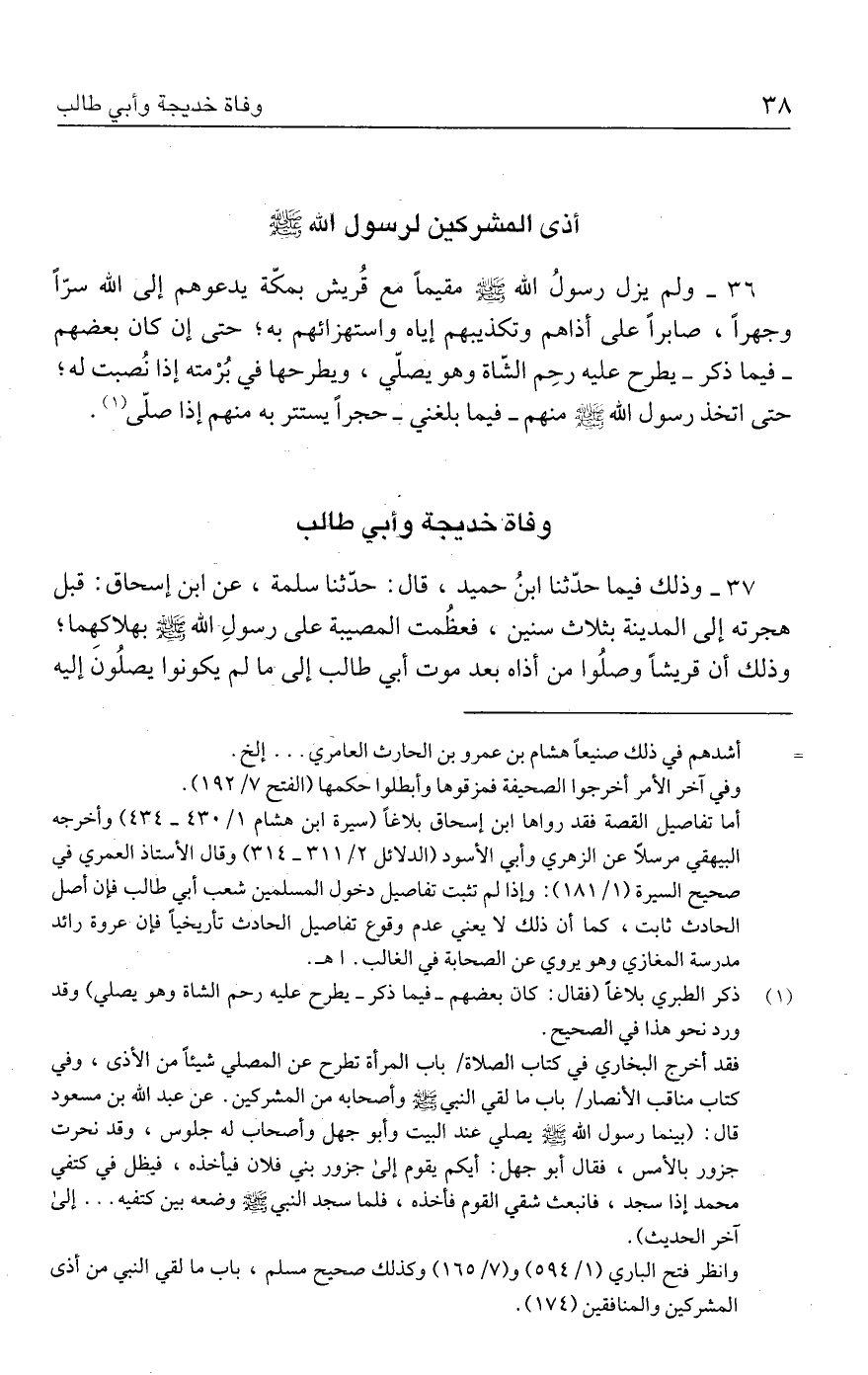 ٣٧ - وذلك فيما حدَّثنا ابنُ حميد، قال: حدَّثنا سلمة، عن ابن إسحاق: قبل هجرته إلى المدينة بثلاث سنين، فعظُمت المصيبة على رسولِ الله - صلى الله عليه وسلم - بهلاكهِما؛ وذلك أن قريشًا وصلُوا من أذاه بعد موت أبي طالب إلى ما لم يكونوا يصلُون إليه