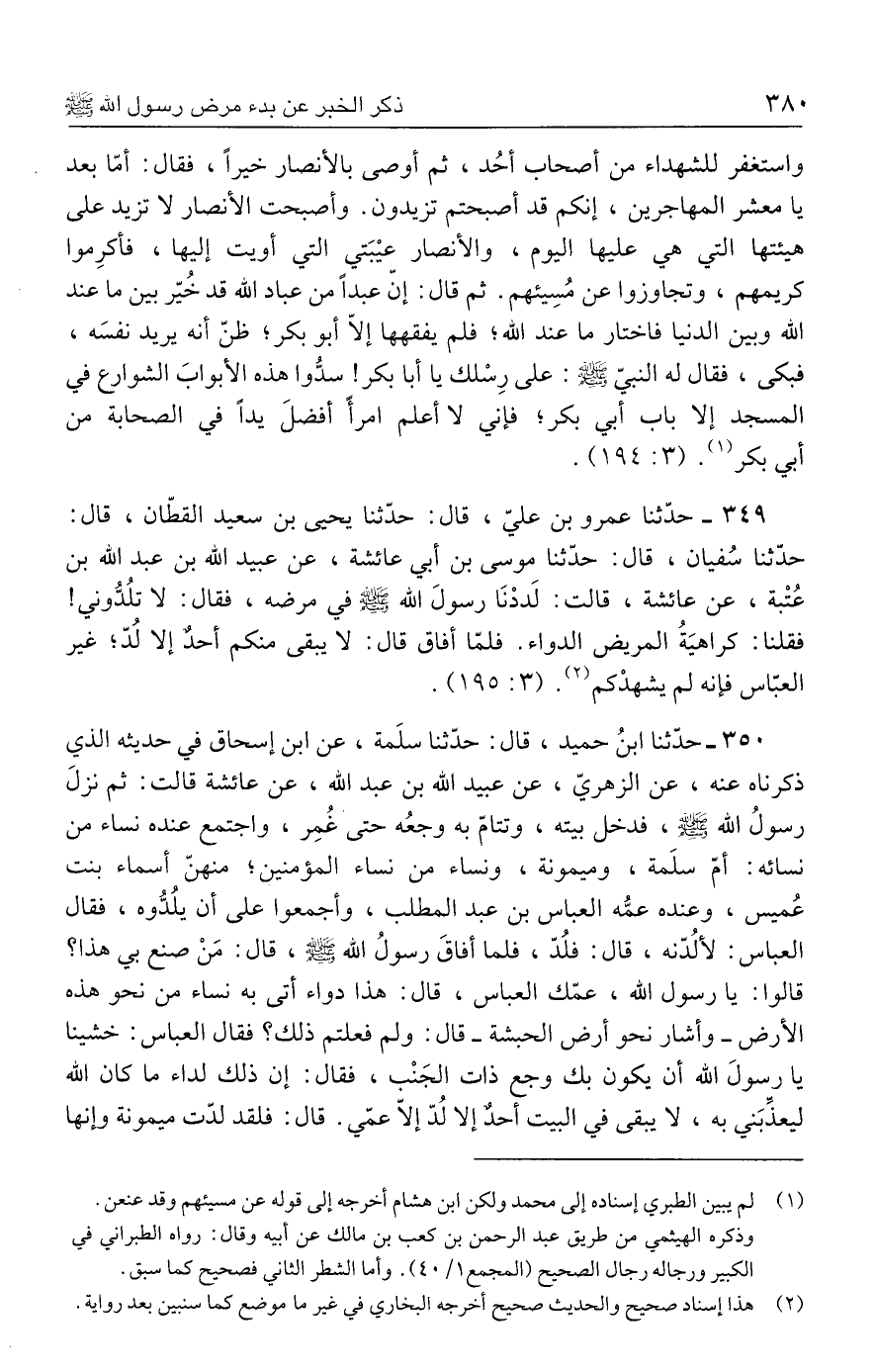 ٣٤٩ - حدَّثنا عمرو بن عليّ، قال: حدَّثنا يحيى بن سعيد القطّان، قال: حدَّثنا سُفيان، قال: حدَّثنا موسى بن أبي عائشة، عن عبيد الله بن عبد الله بن عُتْبة، عن عائشة، قالت: لَددْنَا رسولَ الله - صلى الله عليه وسلم - في مرضه، فقال: لا تلُدُّوني! فقلنا: كراهيَةُ المريض الدواء. فلمّا أفاق قال: لا يبقى منكم أحدٌ إلا لُدّ؛ غير العبّاس فإنه لم يشهدْكم (٢). (٣: ١٩٥).