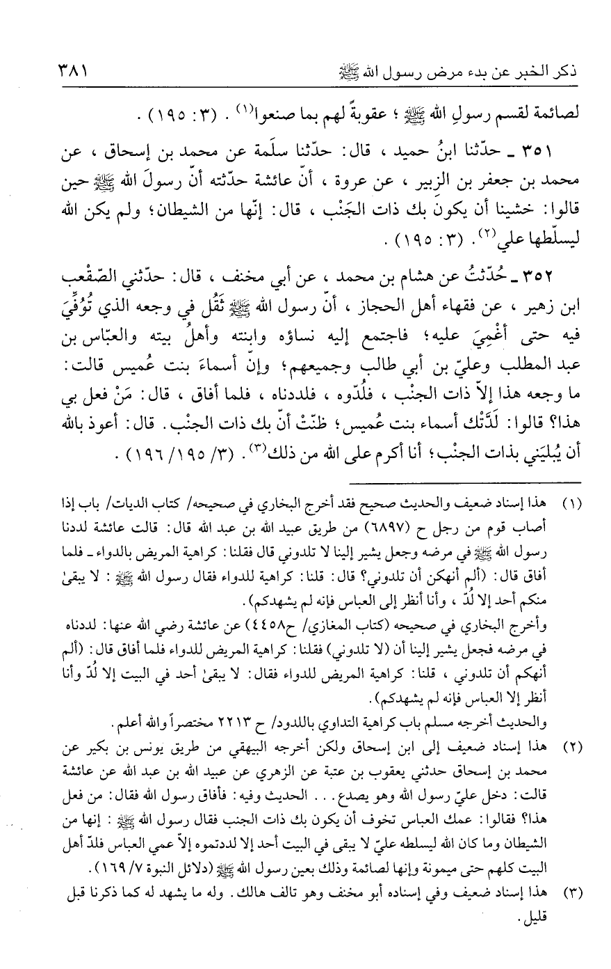 ٣٥٢ - حُدّثتُ عن هشام بن محمد، عن أبي مخنف، قال: حدّثني الصّقْعب بن زهير، عن فقهاء أهل الحجاز، أنّ رسول الله - صلى الله عليه وسلم - ثَقُل في وجعه الذي تُوُفَيَ فيه حتى أغْمِيَ عليه؛ فاجتمع إليه نساؤه وابنته وأهلُ بيته والعبّاس بن عبد المطلب وعليّ بن أبي طالب وجميعهم؛ وإن أسماءَ بنت عُميس قالت: ما وجعه هذا إلّا ذات الجنْب، فلُدّوه، فلددناه، فلما أفاق، قال: مَنْ فعل بي هذا؟ قالوا: لَدَّتْك أسماء بنت عُميس؛ ظنّتْ أنّ بك ذات الجنْب. قال: أعوذ بالله أن يُبليَني بذات الجنْب؛ أنا أكرم على الله من ذلك (٣). (٣/ ١٩٥ / ١٩٦).
