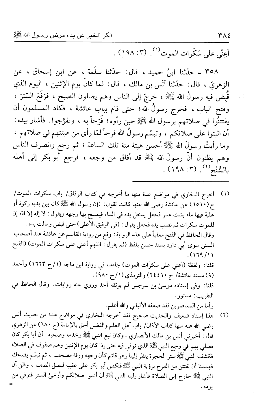 ٣٥٨ - حدَّثنا ابنُ حميد، قال: حدَّثنا سلَمة، عن ابن إسحاق، عن الزهريّ، قال: حدَّثنا أنس بن مالك، قال: لما كانَ يوم الإثنين، اليوم الذي قُبِض فيه رسولُ الله - صلى الله عليه وسلم -، خرجَ إلى الناس وهم يصلون الصبح، فرَفَعَ السّترَ، وفتح الباب، فخرج رسولُ الله؛ حتى قام بباب عائشة، فكاد المسلمون أن يفتتنُوا في صلاتهم برسول الله - صلى الله عليه وسلم - حين رأوه؛ فَرَحًا به، وتفرَّجوا. فأشار بيده: أن اثبتوا على صلاتكم، وتبسّم رسولُ الله فرحًا لمّا رأى من هيئتهم في صلاتهم، وما رأيتُ رسولَ الله - صلى الله عليه وسلم - أحسن هيئة منة تلك الساعة؛ ثم رجع وانصرف الناس وهم يظنون أنّ رسولَ الله - صلى الله عليه وسلم - قد أفاق من وجعه، فرجع أبو بكر إلى أهله بالسُّنْح (٢). (٣: ١٩٨).