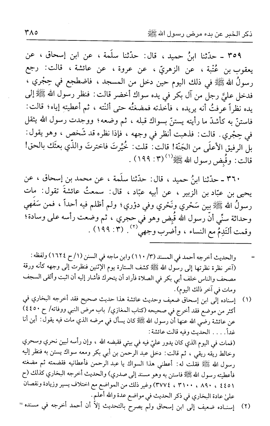 ٣٥٩ - حدَّثنا ابنُ حميد، قال: حدَّثنا سلَمة، عن ابن إسحاق، عن يعقوب بن عُتْبة، عن الزهريّ، عن عروة، عن عائشة، قالت: رجع رسولُ الله - صلى الله عليه وسلم - في ذلك اليوم حين دخل من المسجد، فاضطجع في حِجْري، فدخل عليَّ رجل من آل بكر في يده سواك أخضر قالت: فنظر رسول الله - صلى الله عليه وسلم - إلى يده نظرًا عرفتُ أنه يريده، فأخذته فمضغتُه حتى ألنْته، ثم أعطيته إياه؛ قالت: فاستنّ به كأشدّ ما رأيته يستنّ بسواك قبله، ثم وضعه؛ ووجدت رسول الله يثقل في حِجْري. قالت: فذهبت أنظر في وجهه، فإذا نظره قد شَخص، وهو يقول: بل الرفيق الأعلَى من الجَنّة! قالت: قلت: خُيِّرتَ فاخترتَ والذّي بعثَك بالحق! قالت: وقُبِض رسول الله - صلى الله عليه وسلم - (١) (٣: ١٩٩).