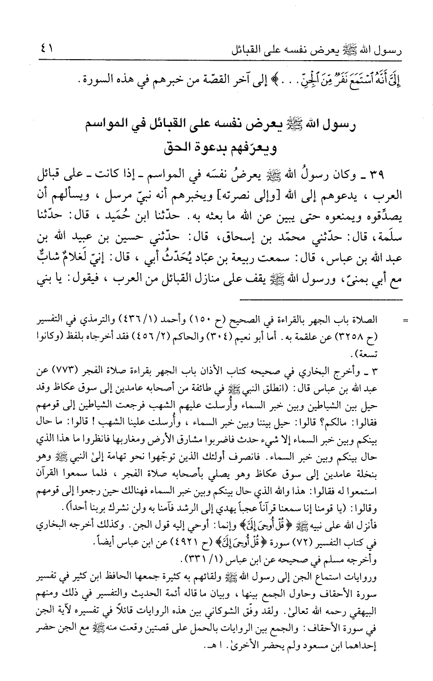 ٣ - وأخرج البخاري في صحيحه كتاب الأذان باب الجهر بقراءة صلاة الفجر (٧٧٣) عن عبد الله بن عباس قال: (انطلق النبي - صلى الله عليه وسلم - في طائفة من أصحابه عامدين إلى سوق عكاظ وقد حيل بين الشياطين وبين خبر السماء وأرسلت عليهم الشهب فرجعت الشياطين إلى قومهم فقالوا: ما لكم؟ قالوا: حيل بيننا وبين خبر السماء، وأُرسلت علينا الشهب! قالوا: ما حال بينكم وبين خبر السماء إلا شيء حدث فاضربوا مشارق الأرض ومغاربها فانظروا ما هذا الذي حال بينكم وبين خبر السماء. فانصرف أولئك الذين توجّهوا نحو تهامة إلى النبي - صلى الله عليه وسلم - وهو بنخلة عامدين إلى سوق عكاظ وهو يصلي بأصحابه صلاة الفجر، فلما سمعوا القرآن استمعوا له فقالوا: هذا والله الذي حال بينكم وبين خبر السماء فهنالك حين رجعوا إلى قومهم وقالوا: (يا قومنا إنا سمعنا قرآنًا عجبًا يهدي إلى الرشد فآمنا به ولن نشرك بربنا أحدًا).
