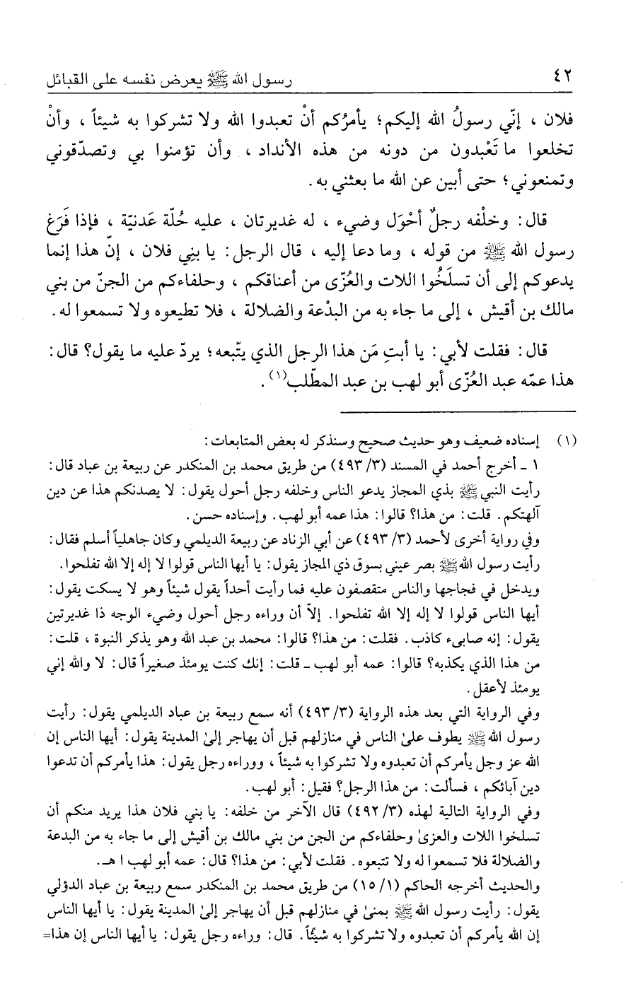وفي الرواية التي بعد هذه الرواية (٣/ ٤٩٣) أنه سمع ربيعة بن عباد الديلمي يقول: رأيت رسول الله - صلى الله عليه وسلم - يطوت على الناس في منازلهم قبل أن يهاجر إلى المدينة يقول: أيها الناس إن الله عزَّ وجلَّ يأمركم أن تعبدوه ولا تشركوا به شيئًا، ووراءه رجل يقول: هذا يأمركم أن تدعوا دين آبائكم، فسألت: من هذا الرجل؟ فقيل: أبو لهب.