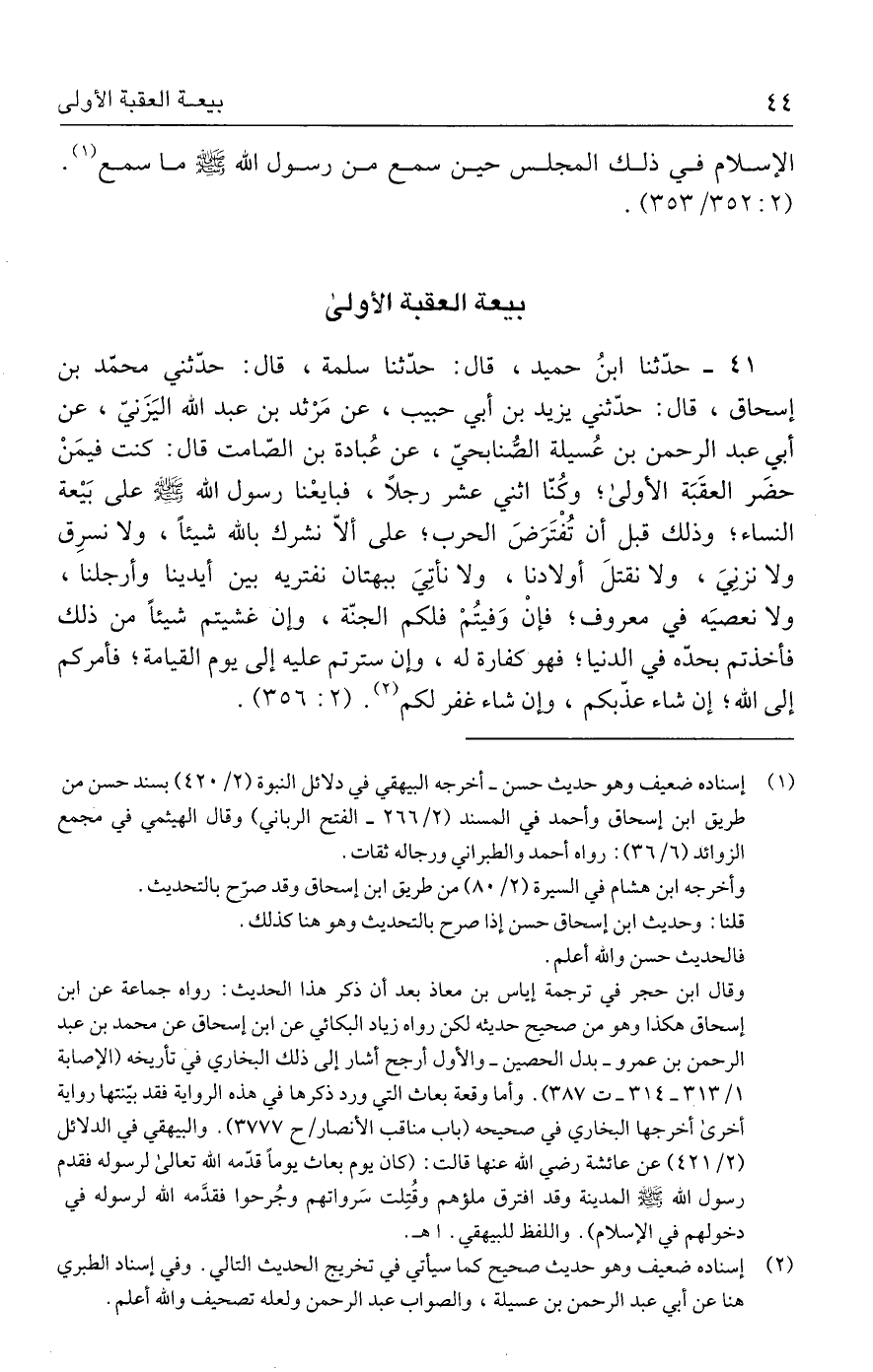 ٤١ - حدَّثنا ابنُ حميد، قال: حدَّثنا سلمة، قال: حدّثني محمّد بن إسحاق، قال: حدّثني يزيد بن أبي حبيب، عن مَرْثد بن عبد الله اليَزَنيّ، عن أبي عبد الرحمن بن عُسيلة الصنابحيّ، عن عُبادة بن الصّامت قال: كنت فيمَنْ حضَر العقَبَة الأولى؛ وكُنّا اثني عشر رجلًا، فبايعْنا رسول الله - صلى الله عليه وسلم - على بَيعة النساء؛ وذلك قبل أن تُفْتَرَضَ الحرب؛ على ألّا نشرك بالله شيئًا، ولا نسرِق ولا نزنِيَ، ولا نقتلَ أولادنا، ولا نأتِيَ ببهتان نفتريه بين أيدينا وأرجلنا، ولا نعصيَه في معروف؛ فإنْ وَفيتُمْ فلكم الجنّة، وإن غشيتم شيئًا من ذلك فأخذتم بحدّه في الدنيا؛ فهو كفارة له، وإن سترتم عليه إلى يوم القيامة؛ فأمركم إلى الله؛ إن شاء عذّبكم، وإن شاء غفر لكم (٢). (٢: ٣٥٦).