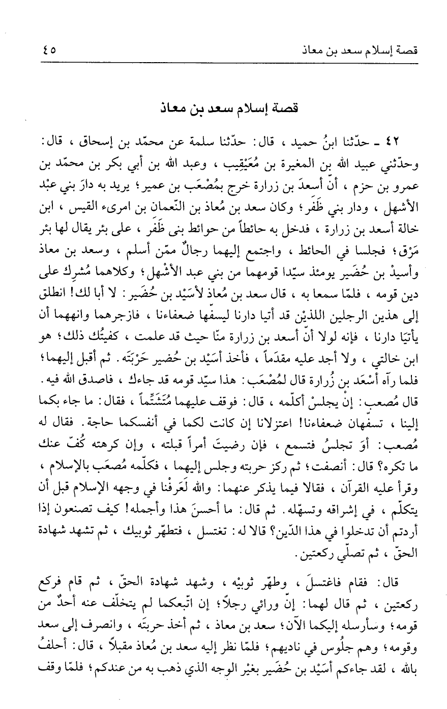 ٤٢ - حدَّثنا ابنُ حميد، قال: حدَّثنا سلمة عن محمّد بن إسحاق، قال: وحدّثني عبيد الله بن المغيرة بن مُعَيقِيب، وعبد الله بن أبي بكر بن محمّد بن عمرو بن حزم، أنّ أسعدَ بن زرارة خرج بمُصْعَب بن عمير، يريد به دارَ بني عبْد الأشهل، ودار بني ظَفَر؛ وكان سعد بن مُعاذ بن النّعمان بن امرئ القيس، ابن خالة أسعد بن زرارة، فدخل به حائطًا من حوائط بني ظَفَر، على بئر يقال لها بئر مَرْق؛ فجلسا في الحائط، واجتمع إليهما رجالٌ ممّن أسلم، وسعد بن معاذ وأسيْد بن حُضَير يومئذ سيّدا قومهما من بني عبد الأشْهل؛ وكلاهما مُشرِك على دين قومه، فلمّا سمعا به، قال سعد بن مُعاذ لأسَيد بن حُضَير: لا أبا لك! انطلق إلى هذين الرجلين اللذين قد أتيا دارنا ليسفّها ضعفاءنا، فازجرهما وانههما أن يأتيَا دارنا، فإنه لولا أنّ أسعد بن زرارة منّا حيت قد علمت، كفيتُك ذلك؛ هو ابن خالتي، ولا أجد عليه مقدَمًا، فأخذ أسَيد بن حُضير حَرْبَتَه. ثم أقبل إليهما؛ فلما رآه أسْعَد بن زُرارة قال لمُصْعَب: هذا سيّد قومه قد جاءك، فاصدق الله فيه. قال مُصعب: إنْ يجلسْ أكلّمه، قال: فوقف عليهما مُتَشَتِّمًا، فقال: ما جاء بكما إلينا، تسفّهان ضعفاءنا! اعتزلانا إن كانت لكما في أنفسكما حاجة. فقال له مُصعب: أوَ تجلسُ فتسمع، فإن رضيتَ أمرًا قبلته، وإن كرهته كُفّ عنك ما تكره؟ قال: أنصفت؛ ثم ركز حربته وجلس إليهما، فكلّمه مُصعَب بالإسلام، وقرأ عليه القرآن، فقالا فيما يذكر عنهما: والله لَعَرفْنا في وجهه الإسلام قبل أن يتكلّم، في إشراقه وتسهّله. ثم قال: ما أحسنَ هذا وأجمله! كيف تصنعون إذا أردتم أن تدخلوا في هذا الدّين؟ قالا له: تغتسل، فتطهّر ثوبيك، ثم تشهد شهادة الحقّ، ثم تصلّي ركعتين.