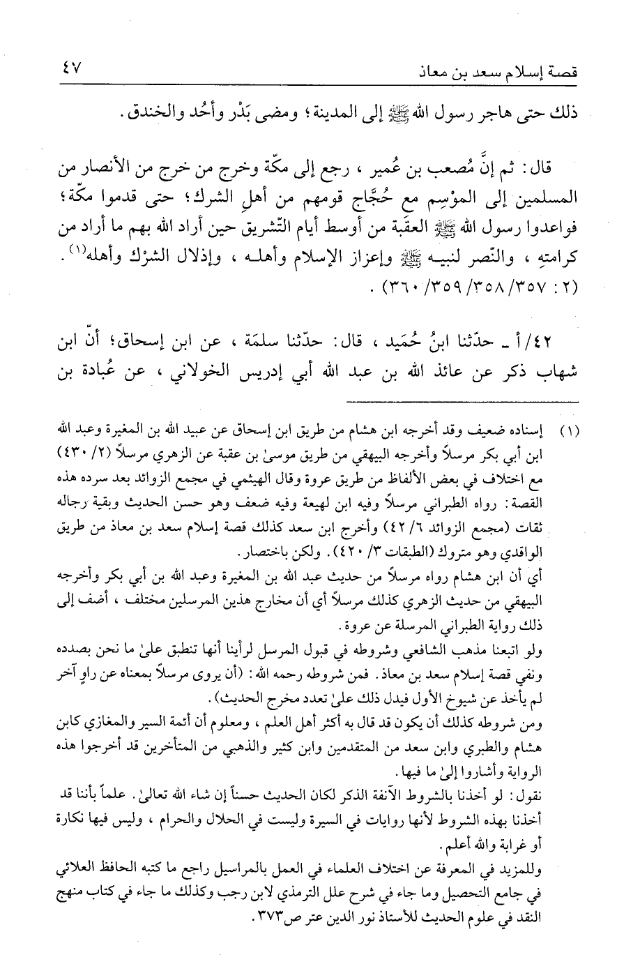 (١) إسناده ضعيف وقد أخرجه ابن هشام من طريق ابن إسحاق عن عبيد الله بن المغيرة وعبد الله بن أبي بكر مرسلًا وأخرجه البيهقي من طريق موسى بن عقبة عن الزهري مرسلًا (٢/ ٤٣٠) مع اختلاف في بعض الألفاظ من طريق عروة وقال الهيثمي في مجمع الزوائد بعد سرده هذه القصة: رواه الطبراني مرسلًا وفيه ابن لهيعة وفيه ضعف وهو حسن الحديث وبقية رجاله ثقات (مجمع الزوائد ٦/ ٤٢) وأخرج ابن سعد كذلك قصة إسلام سعد بن معاذ من طريق الواقدي وهو متروك (الطبقات ٣/ ٤٢٠). ولكن باختصار.