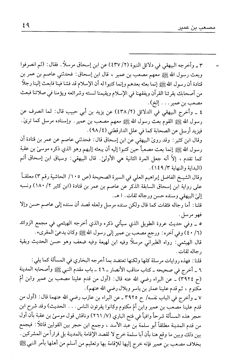 ٤ - وأخرج البيهقي في الدلائل (٢/ ٤٣٨) عن يزيد بن أبي حبيب قال: لما انصرف عن رسول الله - صلى الله عليه وسلم - القوم بعث رسول الله - صلى الله عليه وسلم - معهم مصعب بن عمير. وإسناده مرسل كما ترى. فيزيد أرسل عن الصحابة كما في علل الدارقطني (٤/ ٩٨).