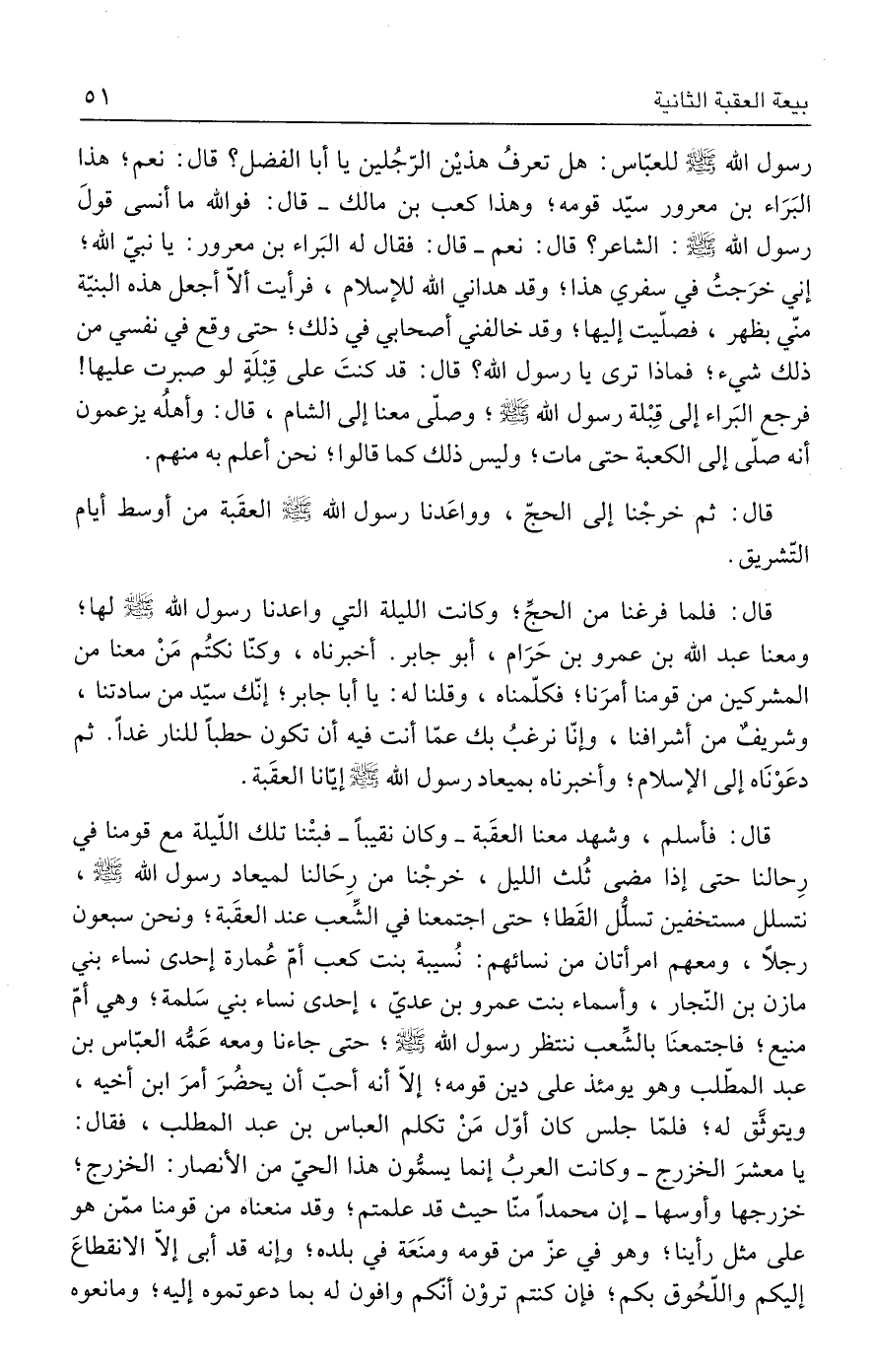قال: فأسلم، وشهد معنا العقَبة -وكان نقيبًا- فبتْنا تلك اللّيلة مع قومنا في رِحالنا حتى إذا مضى ثُلث الليل، خرجْنا من رِحَالنا لميعاد رسول الله - صلى الله عليه وسلم -، نتسلل مستخفين تسلُّل القَطا؛ حتى اجتمعنا في الشِّعب عند العقَبة؛ ونحن سبعون رجلًا، ومعهم امرأتان من نسائهم: نُسيبة بنت كعب أمّ عُمارة إحدى نساء بني مازن بن النّجار، وأسماء بنت عمرو بن عديّ، إحدى نساء بني سَلمة؛ وهي أمّ منيع؛ فاجتمعنَا بالشِّعب ننتظر رسول الله - صلى الله عليه وسلم -؛ حتى جاءنا ومعه عَمُّه العبّاس بن عبد المطّلب وهو يومئذ على دين قومه؛ إلّا أنه أحبّ أن يحضُرَ أمرَ ابن أخيه، ويتوثَّق له؛ فلمّا جلس كان أوّل مَنْ تكلم العباس بن عبد المطلب، فقال: يا معشرَ الخزرج -وكانت العربُ إنما يسمُّون هذا الحيّ من الأنصار: الخزرج؛ خزرجها وأوسها- إن محمدًا منا حيث قد علمتم؛ وقد منعناه من قومنا ممّن هو على مثل رأينا؛ وهو في عزّ من قومه ومنَعَة في بلده؛ وإنه قد أبى إلّا الانقطاعَ إليكم واللّحُوق بكم؛ فإن كنتم تروْن أنّكم وافون له بما دعوتموه إليه؛ ومانعوه