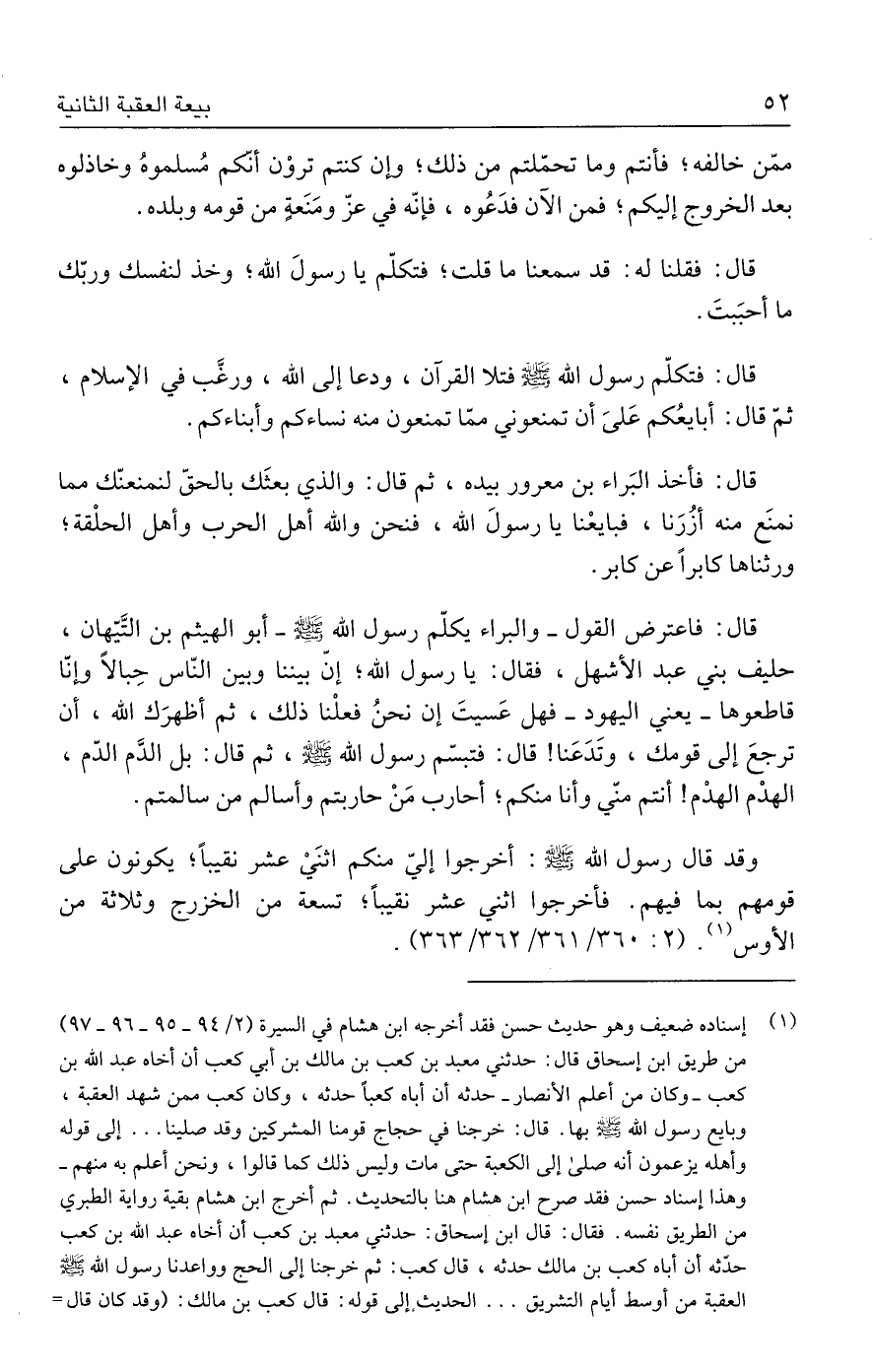وقد قال رسول الله - صلى الله عليه وسلم -: أخرجوا إليّ منكم اثنَي عشر نقيبًا؛ يكونون على قومهم بما فيهم. فأخرجوا اثني عشر نقيبًا؛ تسعة من الخزرج وثلاثة من الأوس (١). (٢: ٣٦٠/ ٣٦١ / ٣٦٢/ ٣٦٣).