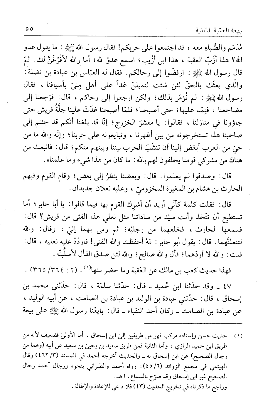 ٤٧ - وقد حدَّثنا ابن حُميد -قال: حدَّثنا سلمَة، قال: حدَثني محمد بن إسحاق، قال: حدّثني عبادة بن الوليد بن عبادة بن الصامت، عن أبيه الوليد، عن عبادة بن الصامت- وكان أحد النقباء- قال: بايعْنا رسول الله - صلى الله عليه وسلم - على بيعة