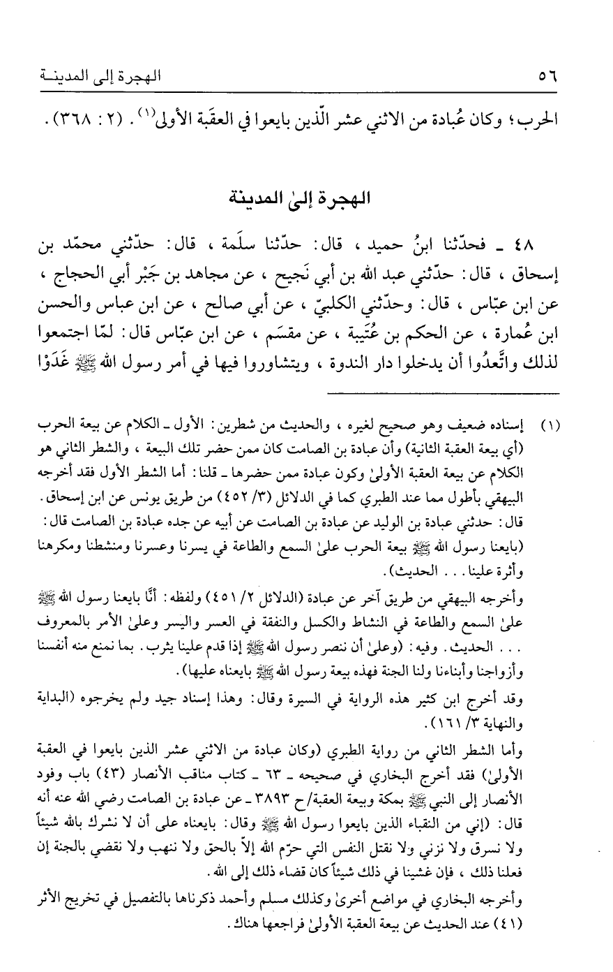(١) إسناده ضعيف وهو صحيح لغيره، والحديث من شطرين: الأول -الكلام عن بيعة الحرب (أي بيعة العقبة الثانية) وأن عبادة بن الصامت كان ممن حضر تلك البيعة، والشطر الثاني هو الكلام عن بيعة العقبة الأولى وكون عبادة ممن حضرها- قلنا: أما الشطر الأول فقد أخرجه البيهقي بأطول مما عند الطبري كما في الدلائل (٣/ ٤٥٢) من طريق يونس عن ابن إسحاق. قال: حدثني عبادة بن الوليد عن عبادة بن الصامت عن أبيه عن جده عبادة بن الصامت قال: (بايعنا رسول الله - صلى الله عليه وسلم - بيعة الحرب على السمع والطاعة في يسرنا وعسرنا ومنشطنا ومكرهنا وأثرة علينا ... الحديث).