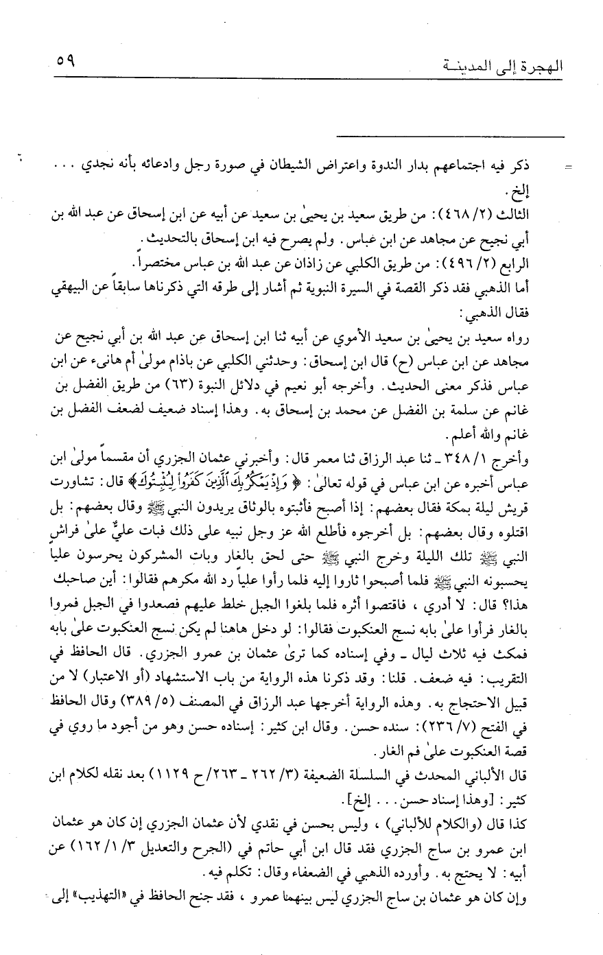 وأخرج ١/ ٣٤٨ - ثنا عبد الرزاق ثنا معمر قال: وأخبرني عثمان الجزري أن مقسمًا مولى ابن عباس أخبره عن ابن عباس في قوله تعالى: {وَإِذْ يَمْكُرُ بِكَ الَّذِينَ كَفَرُوا لِيُثْبِتُوكَ} قال: تشاورت قريش ليلة بمكة فقال بعضهم: إذا أصبح فأثبتوه بالوثاق يريدون النبي - صلى الله عليه وسلم - وقال بعضهم: بل اقتلوه وقال بعضهم: بل أخرجوه فأطلع الله عزَّ وجلَّ نبيه على ذلك فبات عليٌّ على فراشٍ النبي - صلى الله عليه وسلم - تلك الليلة وخرج النبي - صلى الله عليه وسلم - حتى لحق بالغار وبات المشركون يحرسون عليًّا يحسبونه النبي - صلى الله عليه وسلم - فلما أصبحوا ثاروا إليه فلما رأوا عليًّا رد الله مكرهم فقالوا: أين صاحبك هذا؟ قال: لا أدري، فاقتصوا أثره فلما بلغوا الجبل خلط عليهم فصعدوا في الجبل فمروا بالغار فرأوا على بابه نسج العنكبوت فقالوا: لو دخل هاهنا لم يكن نسج العنكبوت على بابه فمكث فيه ثلاث ليال- وفي إسناده كما ترى عثمان بن عمرو الجزري. قال الحافظ في التقريب: فيه ضعف. قلنا: وقد ذكرنا هذه الرواية من باب الاستشهاد (أو الاعتبار) لا من قبيل الاحتجاج به. وهذه الرواية أخرجها عبد الرزاق في المصنف (٥/ ٣٨٩) وقال الحافظ في الفتح (٧/ ٢٣٦): سنده حسن. وقال ابن كثير: إسناده حسن وهو من أجود ما روي في قصة العنكبوت على فم الغار.